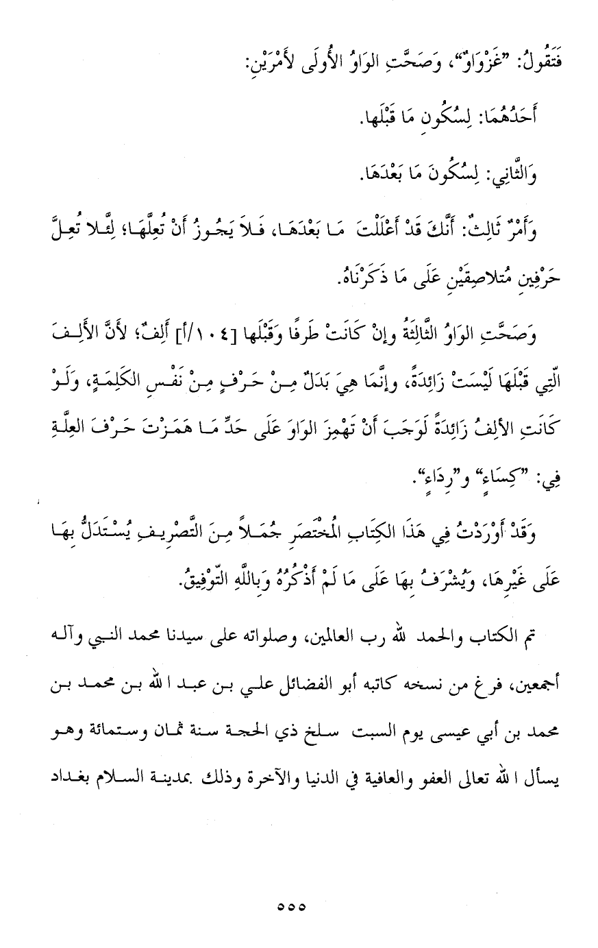 وقد أوردت في هذا الكتاب المختصر جملاً من التّصريف يستدلُّ بها على غيرها، ويُشْرَفُ بها على ما لم أذكره وبالله التّوفيق.