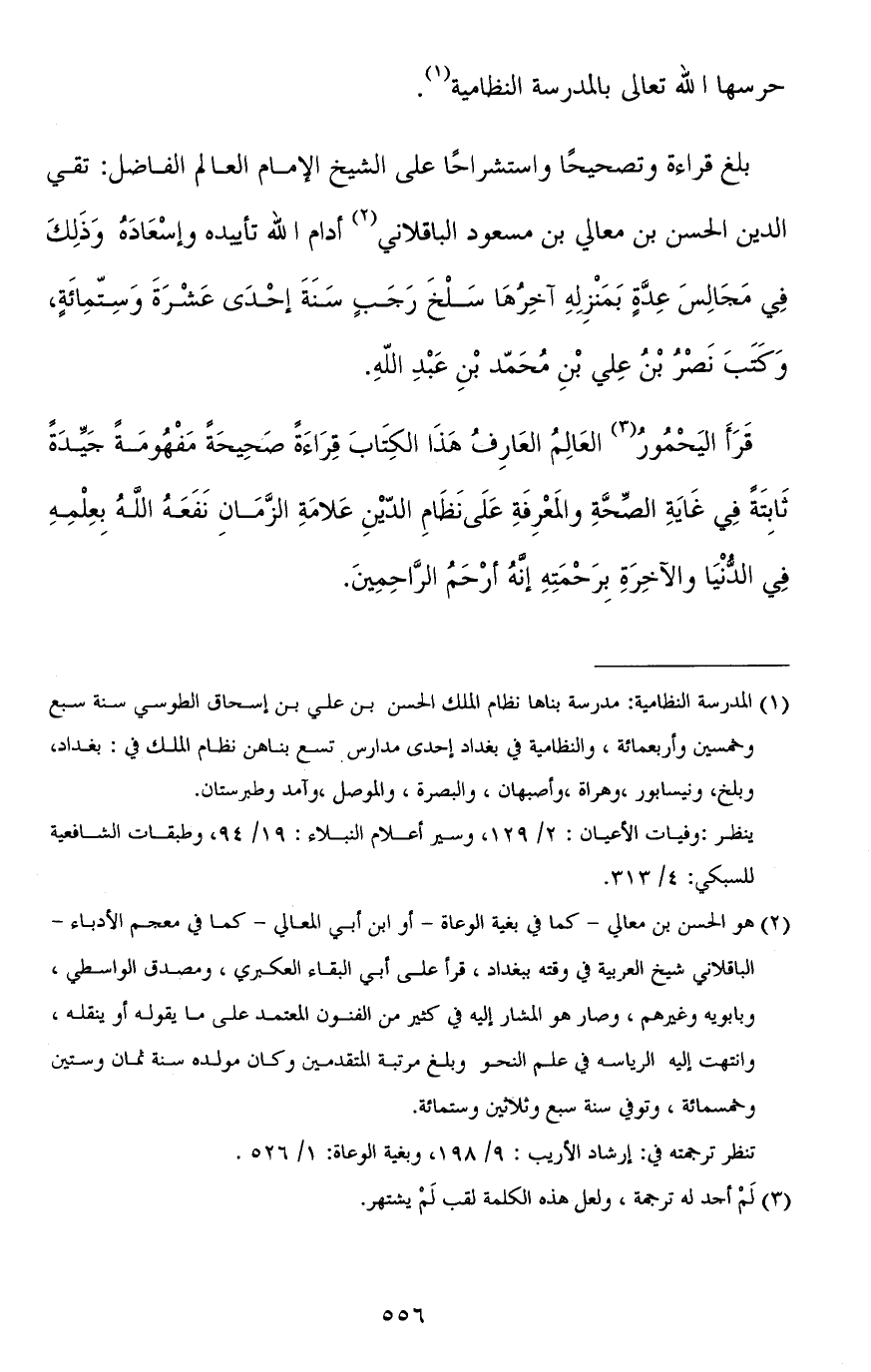 بلغ قراءة وتصحيحًا واستشراحًا على الشيخ الإمام العالم الفاضل: تقي الدين الحسن بن معالي بن مسعود الباقلاني أدام الله تأييده وإسعاده وذلك في مجالس عدَّة بمنزله آخرها سلخ رجب سنة إحدى عشرة وستّمائة، وكتب نصر بن علي بن محمد بن عبد الله.