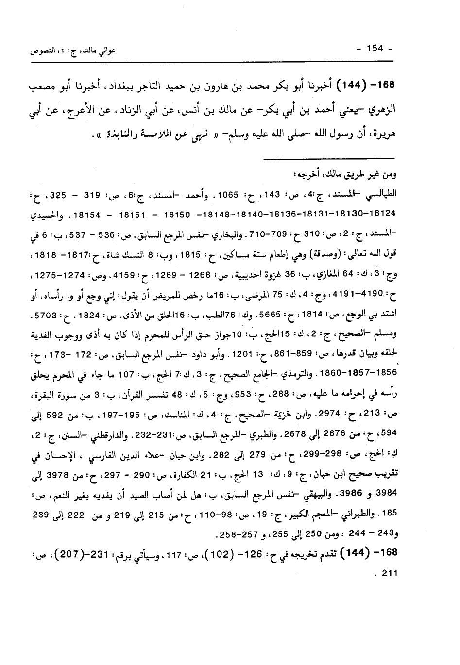 168 - (144) أَخْبَرَنَا أَبُو بَكْرٍ مُحَمَّدُ بْنُ هَارُونَ بْنِ حُمَيْدٍ التَّاجِرُ بِبَغْدَادَ أَخْبَرَنَا أَبُو مُصْعَبٍ الزُّهْرِيُّ يَعْنِي أَحْمَدَ بْنَ أَبِي بَكْرٍ عَنْ مَالِكِ بْنِ أَنَسٍ عَنْ أَبِي الزِّنَادِ عَنِ الأَعْرَجِ عَنْ أَبِي هُرَيْرَةَ أَنَّ رَسُولَ اللَّهِ صَلَّى اللَّهُ عَلَيْهِ وَسَلَّمَ نَهَى عَنِ الْمُلامَسَةِ وَالْمُنَابَذَةِ.