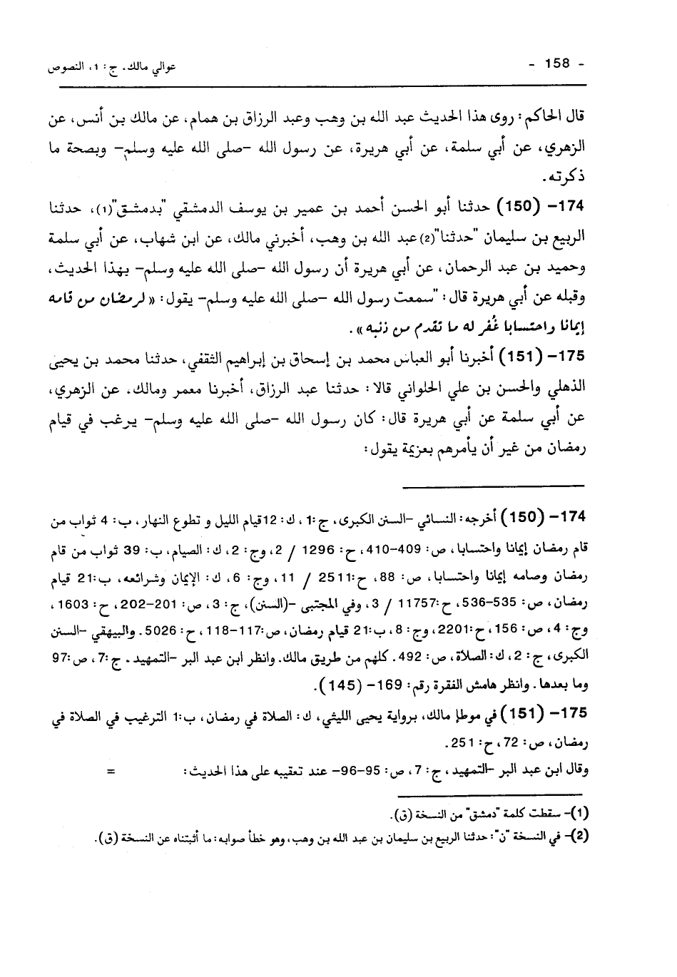 174 - (150) حَدَّثَنَا أَبُو الْحَسَنِ أَحْمَدُ بْنُ عُمَيْرِ بْنِ يُوسُفَ الدِّمَشْقِيُّ بِدِمَشْقَ حَدَّثَنَا الرَّبِيعُ بْنُ سُلَيْمَانَ حَدَّثَنَا عَبْدُ اللَّهِ بْنُ وَهْبٍ أَخْبَرَنِي مَالِكٌ عَنِ ابْنِ شِهَابٍ عَنْ أَبِي سَلَمَةَ وَحُمَيْدِ بْنِ عَبْدِ الرَّحْمَنِ عَنْ أَبِي هُرَيْرَةَ أَنَّ رَسُولَ اللَّهِ صَلَّى اللَّهُ عَلَيْهِ وَسَلَّمَ بِهَذَا الْحَدِيثِ وَقَبْلَهُ عَنْ أَبِي هُرَيْرَةَ قَالَ سَمِعْتُ رَسُولَ اللَّهِ صَلَّى اللَّهُ عَلَيْهِ وَسَلَّمَ يَقُولُ لِرَمَضَانَ مَنْ قَامَهُ إِيمَانًا وَاحْتِسَابًا غُفِرَ لَهُ مَا تَقَدَّمَ مِنْ ذَنْبِهِ.