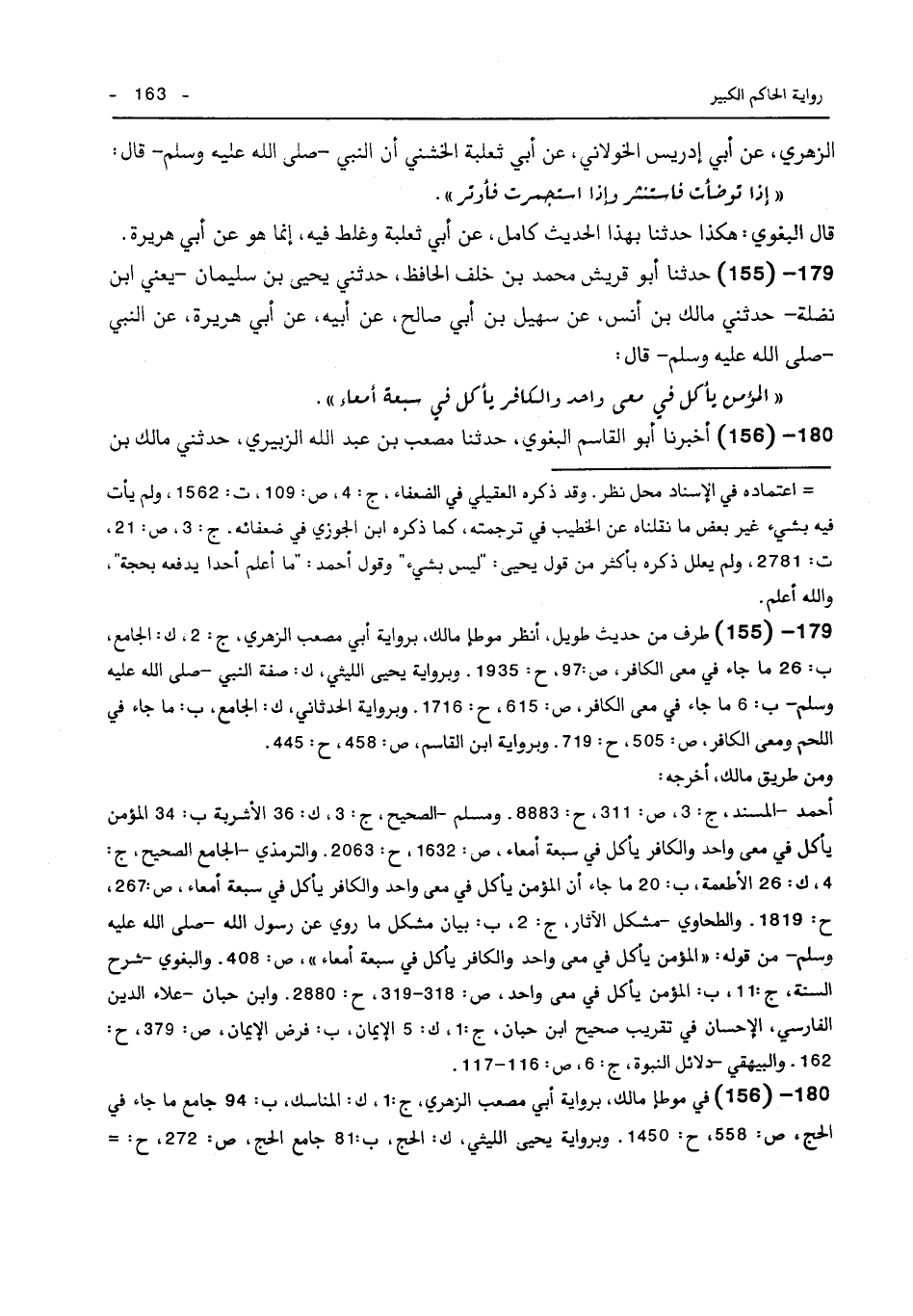 179 - (155) حَدَّثَنَا أَبُو قُرَيْشٍ مُحَمَّدُ بْنُ خَلَفٍ الْحَافِظُ حَدَّثَنِي يَحْيَى بْنُ سُلَيْمَانَ يَعْنِي ابْنَ نَضْلَةَ حَدَّثَنِي مَالِكُ بْنُ أَنَسٍ عَنْ سُهَيْلِ بْنِ أَبِي صَالِحٍ عَنْ أَبِيهِ عَنْ أبي هريرة عن النبي صلى اللَّهُ عَلَيْهِ وَسَلَّمَ قَالَ الْمُؤْمِنُ يَأْكُلُ فِي مَعِيٍّ وَاحِدٍ وَالْكَافِرُ يَأْكُلُ فِي سَبْعَةِ أَمْعَاءٍ.