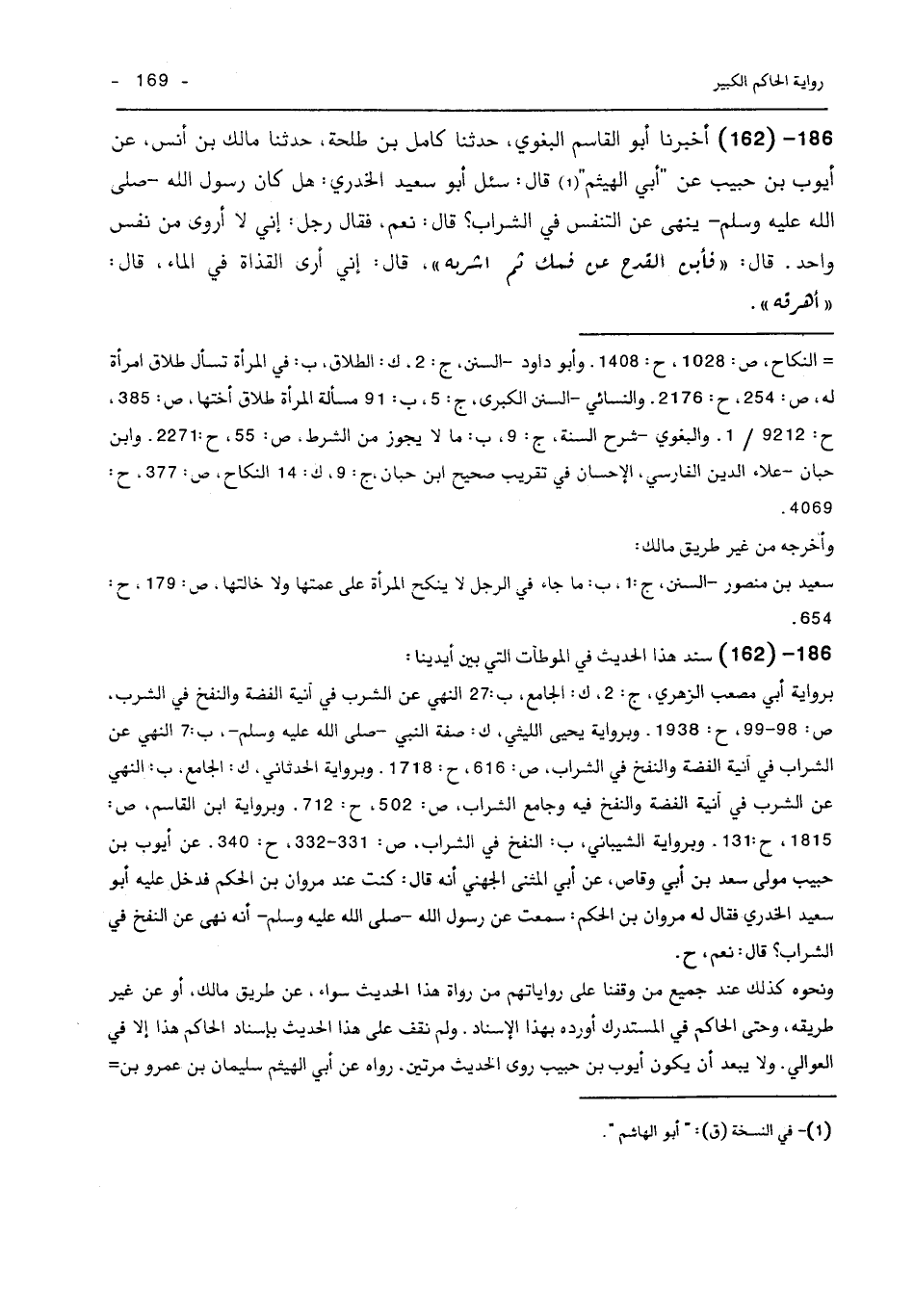 186 - (162) أَخْبَرَنَا أَبُو الْقَاسِمِ الْبَغَوِيُّ حَدَّثَنَا كَامِلُ بْنُ طَلْحَةَ حَدَّثَنَا مَالِكُ بْنُ أَنَسٍ عَنْ أَيُّوبَ بْنِ حَبِيبٍ عَنْ أَبِي الْهَيْثَمِ قَالَ سُئِلَ أَبُو سَعِيدٍ الْخُدْرِيُّ هَلْ كَانَ رَسُولُ اللَّهِ صَلَّى اللَّهُ عَلَيْهِ وَسَلَّمَ يَنْهَى عَنِ التَّنَفُّسِ فِي الشَّرَابِ قَالَ نَعَمْ فَقَالَ رَجُلٌ إِنِّي لا أُرْوَى مِنْ نَفَسٍ وَاحِدٍ قَالَ فَأَبِنِ الْقَدَحَ عَنْ فَمِكَ ثُمَّ اشْرَبْهُ قَالَ إِنِّي أَرَى الْقَذَاةَ فِي الْمَاءِ قَالَ أَهْرِقْهُ.