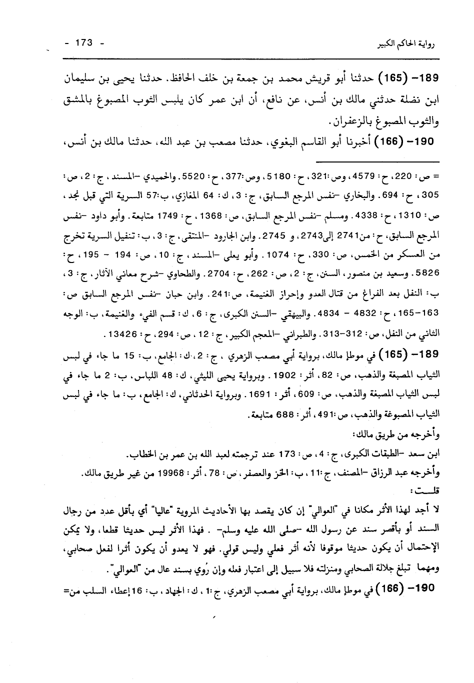 189 - (165) حَدَّثَنَا أَبُو قُرَيْشٍ مُحَمَّدُ بْنُ جُمْعَةَ بْنِ خَلَفٍ الْحَافِظُ حَدَّثَنَا يَحْيَى بْنُ سُلَيْمَانَ بْنِ نَضْلَةَ حَدَّثَنِي مَالِكُ بْنُ أَنَسٍ عَنْ نَافِعٍ أَنَّ ابْنَ عُمَرَ كَانَ يَلْبَسُ الثَّوْبَ الْمَصْبُوغَ بِالْمِشْقِ وَالثَّوْبَ الْمَصْبُوغَ بِالزَّعْفَرَانِ.