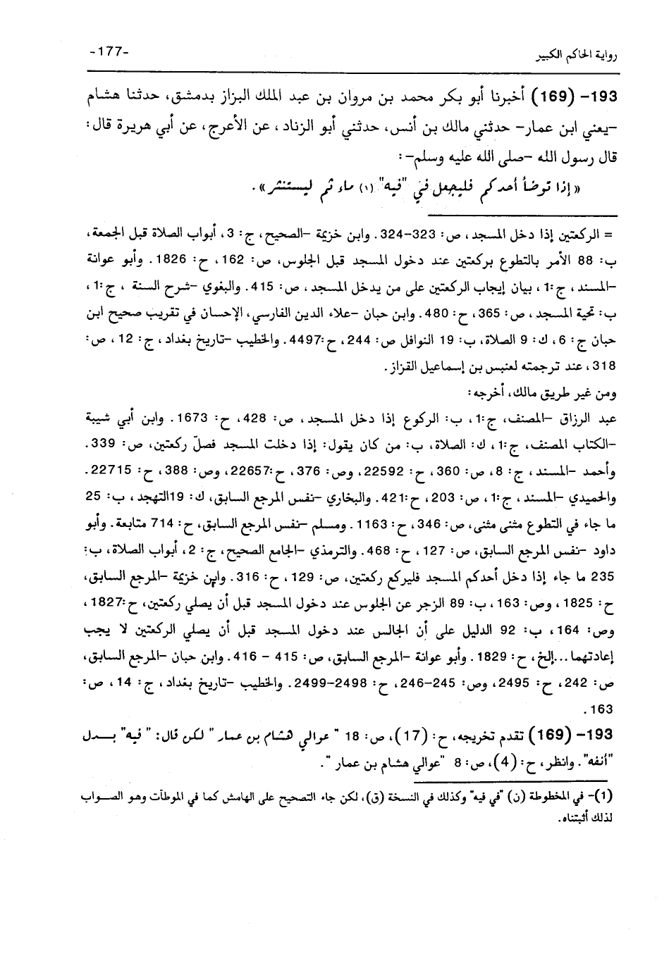 193 - (169) أَخْبَرَنَا أَبُو بَكْرٍ مُحَمَّدُ بْنُ مَرْوَانَ بْنِ عَبْدِ الْمَلِكِ الْبَزَّازُ بِدِمَشْقَ حَدَّثَنَا هِشَامٌ يَعْنِي ابْنَ عَمَّارٍ حَدَّثَنِي مَالِكُ بْنُ أَنَسٍ حَدَّثَنِي أَبُو الزِّنَادِ عَنِ الأَعْرَجِ عَنْ أَبِي هُرَيْرَةَ قَالَ قَالَ رَسُولَ اللَّهِ صَلَّى اللَّهُ عَلَيْهِ وَسَلَّمَ إِذَا تَوَضَّأَ أَحَدُكُمْ فَلْيَجْعَلْ فِي فِيهِ مَاءً ثُمَّ لِيَسْتَنْثِرْ.