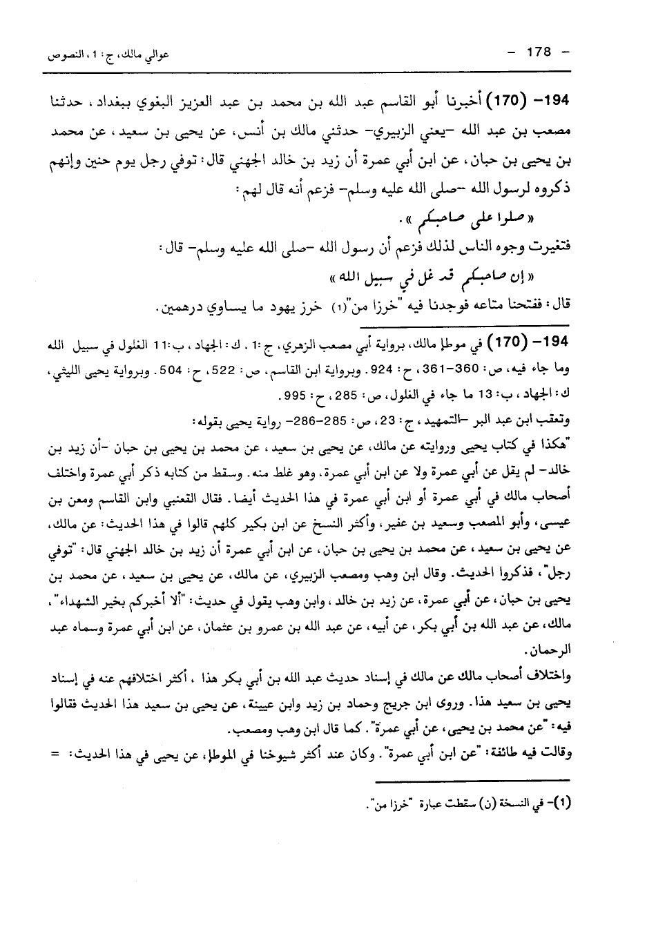 194 - (170) أَخْبَرَنَا أَبُو الْقَاسِمِ عَبْدُ اللَّهِ بْنُ مُحَمَّدِ بْنِ عَبْدِ الْعَزِيزِ الْبَغَوِيُّ بِبَغْدَادَ حَدَّثَنَا مُصْعَبُ بْنُ عَبْدِ اللَّهِ يَعْنِي الزُّبَيْرِيَّ حَدَّثَنِي مَالِكُ بْنُ أَنَسٍ عَنْ يَحْيَى بْنِ سَعِيدٍ عَنْ مُحَمَّدِ بْنِ يَحْيَى بْنِ حِبَّانَ عَنِ ابْنِ أَبِي عَمْرَةَ أَنَّ زَيْدَ بْنَ خَالِدٍ الْجُهَنِيَّ قَالَ تُوُفِّيَ رَجُلٌ يَوْمَ حُنَيْنٍ وَإِنَّهُمْ ذَكَرُوهُ لِرَسُولِ اللَّهِ صَلَّى اللَّهُ عَلَيْهِ وَسَلَّمَ فَزَعَمَ أَنَّهُ قَالَ لَهُمْ صَلُّوا عَلَى صَاحِبِكُمْ فَتَغَيَّرَتْ وُجُوهُ النَّاسِ لِذَلِكَ فَزَعَمَ أَنَّ رَسُولَ اللَّهِ صَلَّى اللَّهُ عَلَيْهِ وَسَلَّمَ قَالَ إِنَّ صَاحِبَكُمْ قَدْ غَلَّ فِي سَبِيلِ اللَّهِ قَالَ فَفَتَحْنَا مَتَاعَهُ فَوَجَدْنَا فِيهِ خَرَزًا مِنْ خَرَزِ يَهُودَ مَا يُسَاوِي دِرْهَمَيْنِ.
