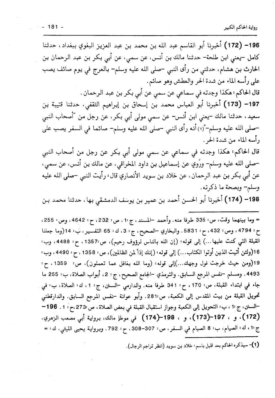 197 - (173) أَخْبَرَنَا أَبُو الْعَبَّاسِ مُحَمَّدُ بْنُ إِسْحَاقَ بْنِ إِبْرَاهِيمَ الثَّقَفِيُّ حَدَّثَنَا قُتَيْبَةُ بْنُ سَعِيدٍ حَدَّثَنَا مَالِكٌ يَعْنِي ابْنَ أَنَسٍ عَنْ سُمَيٍّ مَوْلَى أَبِي بَكْرٍ عَنْ رَجُلٍ مِنْ أَصْحَابِ النَّبِيِّ صَلَّى اللَّهُ عَلَيْهِ وَسَلَّمَ أَنَّهُ رَأَى النَّبِيَّ صَلَّى اللَّهُ عَلَيْهِ وَسَلَّمَ صَائِمًا في سفر يَصُبُّ عَلَى رَأْسِهِ الْمَاءَ مِنْ شِدَّةِ الْحَرِّ. قَالَ الْحَاكِمُ هَكَذَا وَجَدْتُهُ فِي سَمَاعِي عَنْ سُمَيٍّ مَوْلَى أَبِي بَكْرٍ عَنْ رَجُلٍ مِنْ أَصْحَابِ النَّبِيِّ صَلَّى اللَّهُ عَلَيْهِ وَسَلَّمَ وَرُوِيَ عَنْ إِسْمَاعِيلَ بْنِ دَاوُدَ الْمِخْرَاقِيِّ عَنْ مَالِكِ بْنُ أَنَسٍ عَنْ سُمَيٍّ عَنْ أَبِي بَكْرِ بْنِ عَبْدِ الرَّحْمَنِ عَنْ خَلادِ بْنِ سُوَيْدٍ الأَنْصَارِيِّ قَالَ رَأَيْتُ النَّبِيَّ صَلَّى اللَّهُ عَلَيْهِ وَسَلَّمَ وَبِصِحَّةِ مَا ذَكَرْتُهُ.