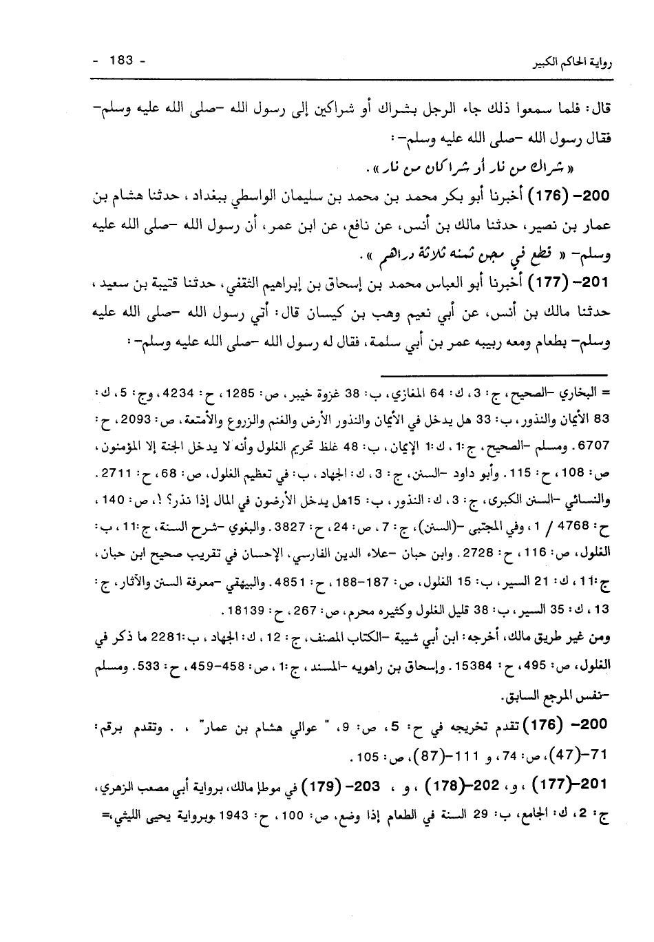 201 - (177) أَخْبَرَنَا أَبُو الْعَبَّاسِ مُحَمَّدُ بْنُ إِسْحَاقَ بْنِ إِبْرَاهِيمَ الثَّقَفِيُّ حَدَّثَنَا قُتَيْبَةُ بْنُ سَعِيدٍ حَدَّثَنَا مَالِكٌ بْنُ أَنَسٍ عَنْ أَبِي نُعَيْمٍ وَهْبِ بْنِ كَيْسَانَ قَالَ أُتِيَ رَسُولَ اللَّهِ صَلَّى اللَّهُ عَلَيْهِ وَسَلَّمَ بِطَعَامٍ وَمَعَهُ رَبِيبُهُ عُمَرُ بن أبي سلمة فَقَالَ رَسُولُ اللَّهِ صَلَّى اللَّهُ عَلَيْهِ وَسَلَّمَ -[184]- سَمِّ اللَّهَ وَكُلْ مِمَّا يَلِيكَ. قَالَ الْحَاكِمُ رَوَى هَذَا الْحَدِيثَ خَالِدُ بْنُ مَخْلَدٍ الْقَطَوَانِيُّ وَيَحْيَى بْنُ صَالِحٍ الْوُحَاظِيُّ عَنْ مَالِكِ بْنِ أَنَسٍ عَنْ وَهْبِ بْنِ كَيْسَانَ عَنْ عُمَرَ بْنِ أَبِي سَلَمَةَ عَنِ النَّبِيِّ صَلَّى اللَّهُ عَلَيْهِ وَسَلَّمَ وَبِصِحَّةِ مَا ذَكَرْتُهُ.