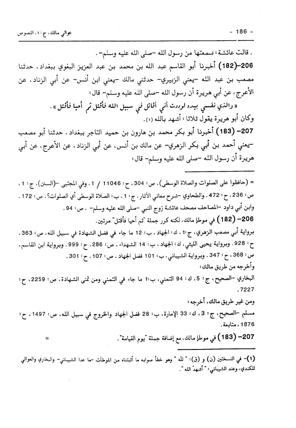 206 - (182) أَخْبَرَنَا أَبُو الْقَاسِمِ عَبْدُ اللَّهِ بْنُ مُحَمَّدِ بْنِ عَبْدِ الْعَزِيزِ الْبَغَوِيُّ بِبَغْدَادَ حَدَّثَنَا مُصْعَبُ بْنُ عَبْدِ اللَّهِ يَعْنِي الزُّبَيْرِيَّ حَدَّثَنِي مَالِكٍ يَعْنِي ابْنَ أَنَسٍ عَنْ أَبِي الزِّنَادِ عَنِ الأَعْرَجِ عَنْ أَبِي هُرَيْرَةَ أَنَّ رَسُولَ اللَّهِ صَلَّى اللَّهُ عَلَيْهِ وَسَلَّمَ قَالَ وَالَّذِي نَفْسِي بِيَدِهِ لَوَدِدْتُ أَنِّي أُقَاتِلُ فِي سَبِيلِ اللَّهِ فَأُقْتَلُ ثُمَّ أُحْيَا فَأُقْتَلُ. وَكَانَ أَبُو هُرَيْرَةَ يَقُولُ ثَلاثًا أَشْهَدُ بِاللَّهِ.