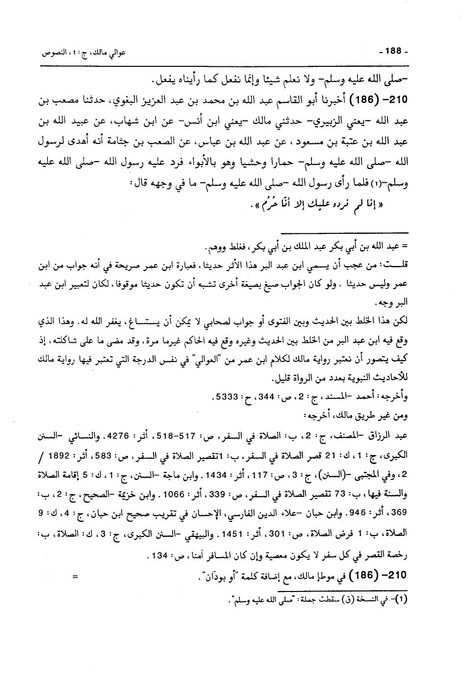 210 - (186) أَخْبَرَنَا أَبُو الْقَاسِمِ عَبْدُ اللَّهِ بْنُ مُحَمَّدِ بْنِ عَبْدِ الْعَزِيزِ الْبَغَوِيُّ حَدَّثَنَا مُصْعَبُ بْنُ عَبْدِ اللَّهِ يَعْنِي الزُّبَيْرِيَّ حَدَّثَنِي مَالِكُ يَعْنِي ابْنَ أَنَسٍ عَنِ ابْنِ شِهَابٍ عَنْ عُبَيْدِ اللَّهِ بْنِ عَبْدِ اللَّهِ بْنِ عُتْبَةَ بْنِ مَسْعُودٍ عَنْ عَبْدِ اللَّهِ بْنِ عَبَّاسٍ عَنِ الصَّعْبِ بْنِ جَثَّامَةَ أَنَّهُ أَهْدَى لِرَسُولِ اللَّهِ صَلَّى اللَّهُ عَلَيْهِ وَسَلَّمَ حِمَارًا وَحْشِيًّا وهو بالأبواء فرد عَلَيْهِ رَسُولُ اللَّهِ صَلَّى اللَّهُ عَلَيْهِ وَسَلَّمَ فَلَمَّا رَأَى رَسُولُ اللَّهِ صَلَّى اللَّهُ عَلَيْهِ وَسَلَّمَ مَا فِي وَجْهِهِ قَالَ إِنَّا لَمْ نَرُدُّهُ عَلَيْكَ إِلا أَنَّا حُرُمٌ.