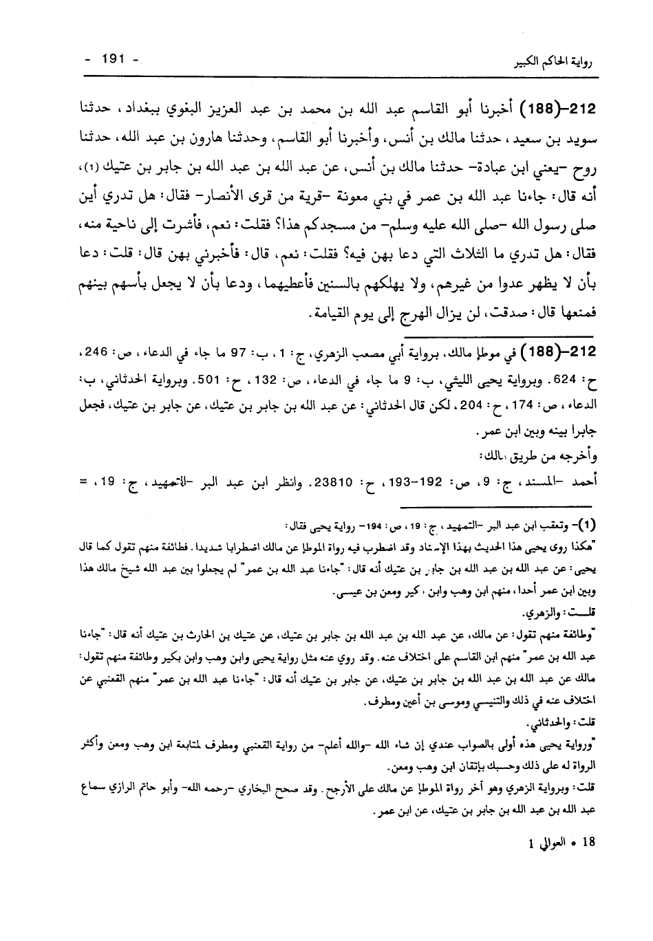 212 - (188) أَخْبَرَنَا أَبُو الْقَاسِمِ عَبْدُ اللَّهِ بْنُ مُحَمَّدِ بْنِ عَبْدِ الْعَزِيزِ الْبَغَوِيُّ بِبَغْدَادَ حَدَّثَنَا سُوَيْدُ بْنُ سَعِيدٍ حَدَّثَنَا مَالِكُ بْنُ أَنَسٍ وَأَخْبَرَنَا أَبُو الْقَاسِمِ وَحَدَّثَنَا هَارُونُ بْنُ عَبْدِ اللَّهِ حَدَّثَنَا رَوْحٌ يَعْنِي ابْنَ عُبَادَةَ حَدَّثَنَا مَالِكُ بْنُ أَنَسٍ عَنْ عَبْدِ اللَّهِ بْنِ عَبْدِ اللَّهِ بْنِ جَابِرِ بْنِ عَتِيكٍ أَنَّهُ قَالَ جَاءَنَا عَبْدُ اللَّهِ بْنُ عُمَرَ فِي بَنِي مَعُونَةَ قَرْيَةٍ مِنْ قُرَى الأَنْصَارِ فَقَالَ هَلْ تَدْرِي أَيْنَ صَلَّى رَسُولُ اللَّهِ صَلَّى اللَّهُ عَلَيْهِ وَسَلَّمَ مِنْ مَسْجِدِكُمْ هَذَا فَقُلْتُ نَعَمْ فَأَشَرْتُ إِلَى نَاحِيَةٍ مِنْهُ فَقَالَ هَلْ تَدْرِي مَا الثَّلاثُ الَّتِي دَعَا بِهِنَّ فِيهِ فَقُلْتُ نَعَمْ قَالَ فَأَخْبِرْنِي بِهِنَّ قَالَ قُلْتُ دَعَا بِأَنْ لا يظهر عدوا من غيرهم وَلا يُهْلِكَهُمْ بِالسِّنِينَ فَأُعْطِيَهُمَا وَدَعَا بِأَنْ لا يَجْعَلَ بَأْسَهُمْ بَيْنَهُمْ فَمُنِعَهَا قَالَ صَدَقْتَ لَنْ يَزَالَ الْهَرْجُ إِلَى يَوْمِ الْقِيَامَةِ.