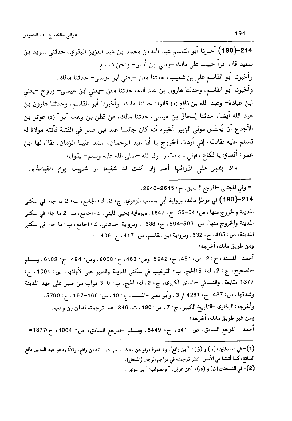 214 - (190) أَخْبَرَنَا أَبُو الْقَاسِمِ عَبْدُ اللَّهِ بْنُ مُحَمَّدِ بْنِ عَبْدِ الْعَزِيزِ الْبَغَوِيُّ حَدَّثَنِي سُوَيْدُ بْنُ سَعِيدٍ قَالَ قَرَأَ حَبِيبٌ عَلَى مَالِكٍ يَعْنِي ابْنَ أَنَسٍ وَنَحْنُ نَسْمَعُ، وَأَخْبَرَنَا أَبُو الْقَاسِمِ عَلِيُّ بْنُ شُعَيْبٍ حَدَّثَنَا مَعْنٌ يَعْنِي ابْنَ عيسى: حدثنا مالك: وأخبرنا أبوالقاسم وَحَدَّثَنَا هَارُونُ بْنُ عَبْدِ اللَّهِ حَدَّثَنَا مَعْنٌ يَعْنِي ابْنَ عِيسَى وَرَوْحٌ يَعْنِي ابْنَ عُبَادَةَ وَعَبْدُ اللَّهِ بْنُ نَافِعٍ قَالُوا حَدَّثَنَا مَالِكٌ وَأَخْبَرَنَا أَبُو الْقَاسِمِ وَحَدَّثَنَا هَارُونُ بْنُ عَبْدِ اللَّهِ أَيْضًا حَدَّثَنَا إِسْحَاقُ بْنُ عِيسَى حَدَّثَنَا مَالِكٌ عَنْ قَطَنُ بْنُ وَهْبِ بْنِ عُوَيْمِرِ بْنِ الأَجْدَعِ أَنَّ يُحَنَّسَ مَوْلَى الزُّبَيْرِ أَخْبَرَهُ أَنَّهُ كَانَ جَالِسًا عِنْدَ ابْنِ عُمَرَ فِي الْفِتْنَةِ فَأَتَتْهُ مَوْلاةٌ لَهُ تسلم عليه فقالت إن أَرَدْتُ الْخُرُوجَ يَا أَبَا عَبْدَ الرَّحْمَنِ اشْتَدَّ عَلَيْنَا الزَّمَانُ فَقَالَ لَهَا ابْنُ عُمَرَ اقْعُدِي يَا لَكَاعُ فَإِنِّي سَمِعْتُ رَسُولَ اللَّهِ صَلَّى اللَّهُ عَلَيْهِ وَسَلَّمَ يَقُولُ لا يَصْبِرُ عَلَى لأْوَائِهَا أَحَدٌ إِلا كُنْتُ لَهُ شَفِيعًا أَوْ شَهِيدًا يَوْمَ الْقِيَامَةِ.