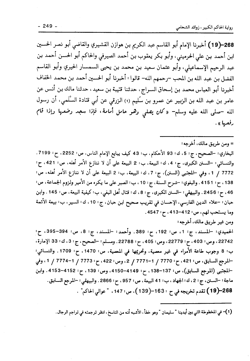 268 - (19) أَخْبَرَنَا الإِمَامُ أَبُو الْقَاسِمِ عَبْدُ الكريم بن هوزان الْقُشَيْرِيُّ وَالْقَاضِي أَبُو نَصْرٍ الْحُسَيْنُ بْنُ أَحْمَدَ بْنِ عَلِيٍّ الْحَرَمَيْنِيُّ وَأَبُو بَكْرٍ يَعْقُوبُ بْنُ أَحْمَدَ الصَّيْرَفِيُّ وَالْحَاكِمُ أَبُو الْحَسَنِ أَحْمَدُ بْنُ عَبْدِ الرَّحِيمِ الإِسْمَاعِيلِيُّ وَأَبُو عُثْمَانَ سَعِيدُ بْنُ مُحَمَّدِ بْنِ يَحْيَى السِّمْسَارُ الْحِيرِيُّ وَأَبُو الْقَاسِمِ الْفَضْلُ بْنُ عَبْدِ اللَّهِ بْنِ الْمُحِبِّ رَحِمَهُمُ اللَّهُ قَالُوا أَخْبَرَنَا أَبُو الْحُسَيْنِ أَحْمَدُ بْنُ مُحَمَّدٍ الْخَفَّافُ أَخْبَرَنَا أَبُو الْعَبَّاسِ مُحَمَّدُ بْنُ إِسْحَاقَ السَّرَّاجُ حَدَّثَنَا قُتَيْبَةُ بْنُ سَعِيدٍ حَدَّثَنَا مَالِكُ بْنُ أَنَسٍ عَنْ عَامِرِ بْنِ عَبْدِ اللَّهِ بْنِ الزُّبَيْرِ عَنْ عَمْرِو بْنِ سُلَيْمٍ الزُّرْقِيِّ عَنْ أَبِي قَتَادَةَ السَّلَمِيِّ أَنَّ رَسُولَ اللَّهِ صَلَّى اللَّهُ عَلَيْهِ وَسَلَّمَ كَانَ يُصَلِّي وَهُوَ حَامِلٌ أُمَامَةَ فَإِذَا سَجَدَ وَضَعَهَا وَإِذَا قَامَ رَفَعَهَا.