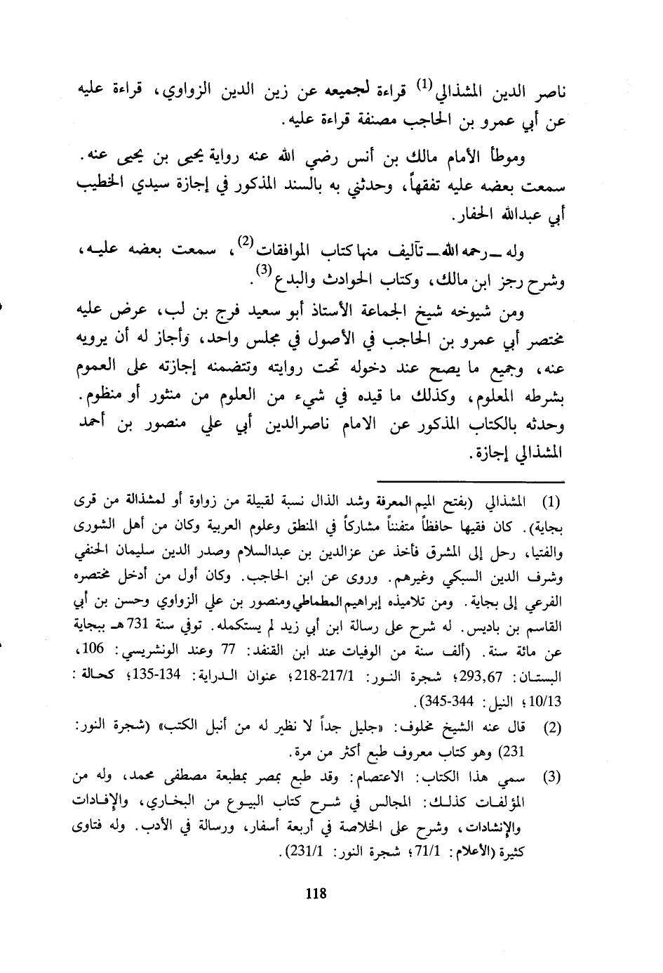 نَاصِر الدّين المشذالي قِرَاءَة لجميعه عَن زين الدّين الزواوي قِرَاءَة عَلَيْهِ عَن أبي عَمْرو بن الْحَاجِب مصنفة قِرَاءَة عَلَيْهِ
