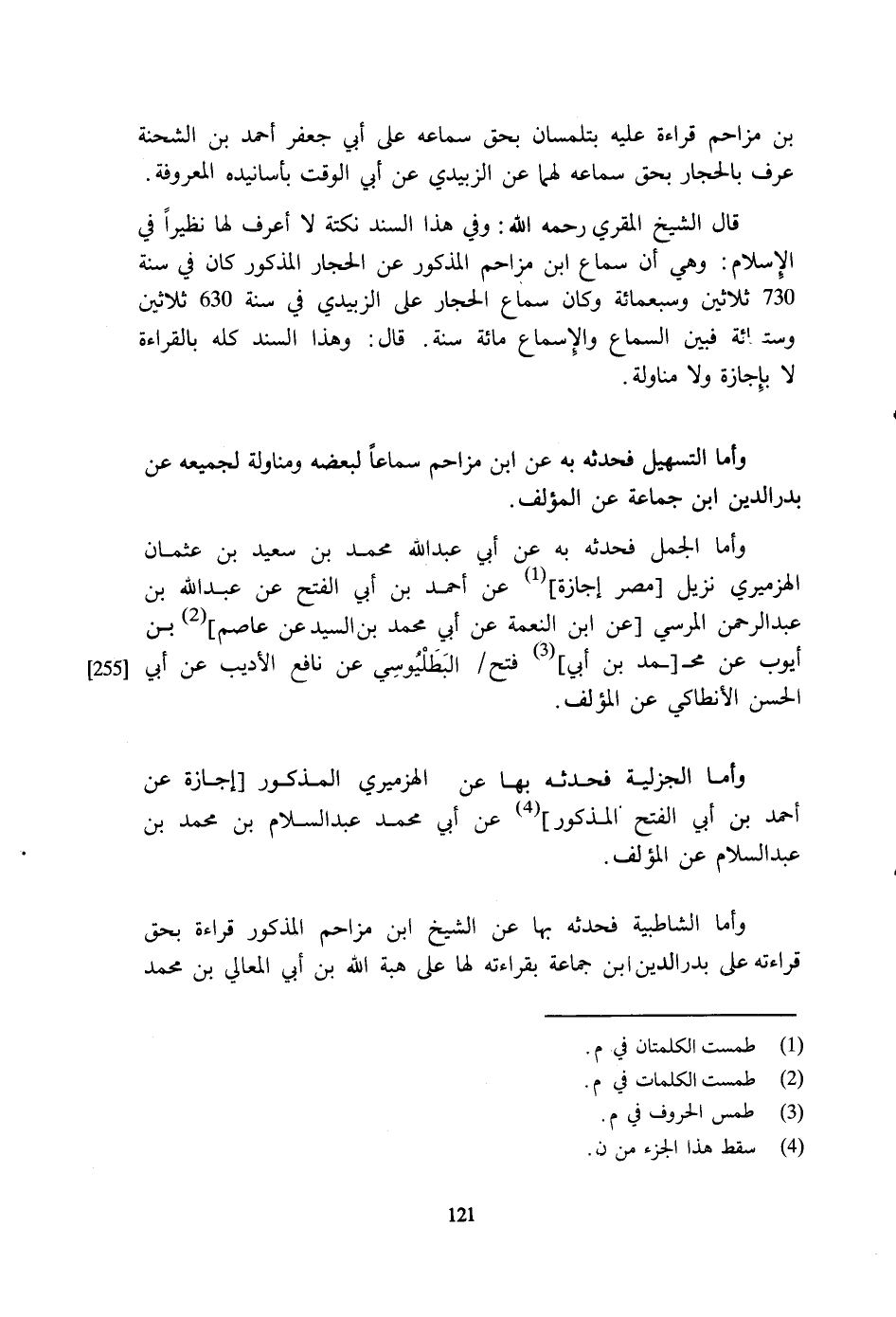 قَالَ الشَّيْخ الْمقري رَحمَه الله وَفِي هَذَا السَّنَد نُكْتَة لَا أعرف لَهَا نظيرا فِي الْإِسْلَام وَهِي أَن سَماع ابْن مُزَاحم الْمَذْكُور عَن الحجار الْمَذْكُور كَانَ فِي سنة 730 ثَلَاثِينَ وَسَبْعمائة وَكَانَ سَماع الحجار على الزبيدِيّ فِي سنة 630 ثَلَاثِينَ وسِتمِائَة فَبين السماع والإسماع مائَة سنة قَالَ وَهَذَا السَّنَد كُله بِالْقِرَاءَةِ لَا بِإِجَازَة وَلَا مناولة