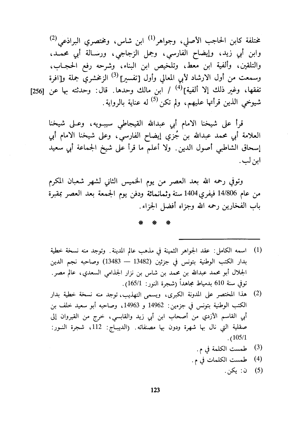مُخْتَلفَة كَابْن الْحَاجِب الْأَصْلِيّ وجواهر ابْن شَاس ومختصري البراذعي وَابْن أبي زيد وإيضاح الْفَارِسِي وجمل الزجاجي ورسالة أبي مُحَمَّد والتلقين وألفية ابْن معط وتلخيص ابْن الْبناء وَشَرحه رفع الْحجاب وَسمعت من أول الْإِرْشَاد لأبي الْمَعَالِي وَأول تَفْسِير الزَّمَخْشَرِيّ جملَة ووافرة تفقها وَغير ذَلِك إِلَّا ألفية ابْن مَالك وَحدهَا قَالَ وحدثته بهَا عَن شيوخي الَّذين قرأتها عَلَيْهِم وَلم تكن لَهُ عناية بالرواية