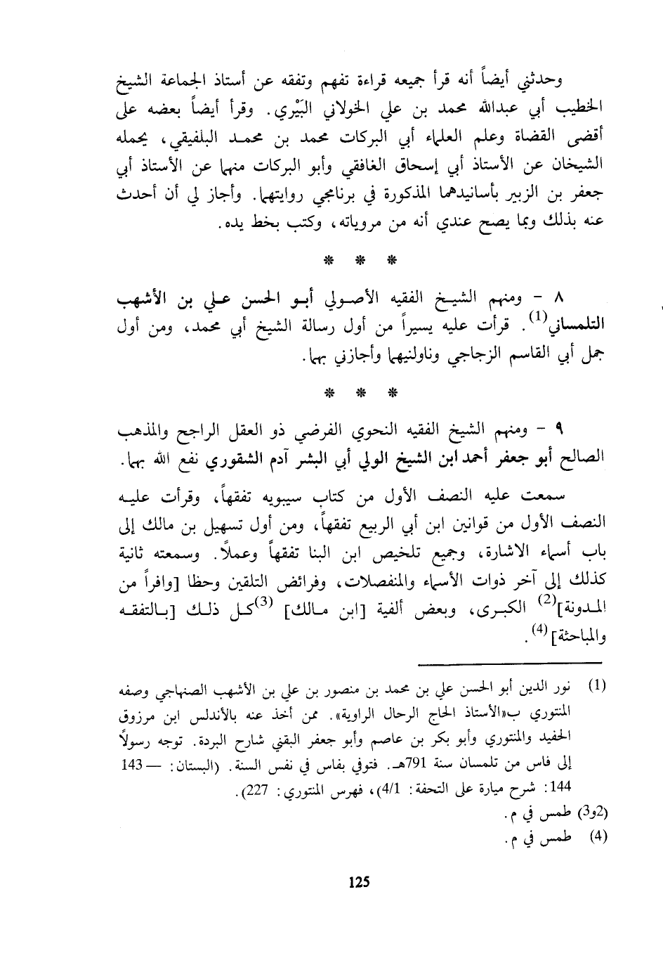 8 - وَمِنْهُم الشَّيْخ الْفَقِيه الأصولي أَبُو الْحسن عَليّ بن الْأَشْهب التلمساني قَرَأت عَلَيْهِ يَسِيرا من أول رِسَالَة الشَّيْخ أبي مُحَمَّد وَمن أول جمل أبي الْقَاسِم الزجاجي وناولنيهما وأجازني بهما