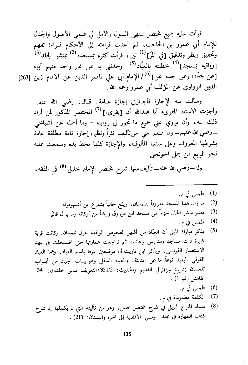 قَرَأت عَلَيْهِ جَمِيع مُخْتَصر مُنْتَهى السول والأمل فِي علمي الْأُصُول والجدل للْإِمَام أبي عَمْرو بن الْحَاجِب ثمَّ أعدت قِرَاءَته إِلَى الْأَحْكَام قِرَاءَة تفهم وَتَحْقِيق وَنظر وتدقيق فِي الْمَرَّتَيْنِ قَرَأت أَكْثَره بمسجده بمنشر الْجلد وَبَاقِيه بِمَسْجِد خطبَته بالعباد وحَدثني بِهِ عَن غير وَاحِد مِنْهُم أَبوهُ عَن جده وَعَن جده عَن الإِمَام أبي عَليّ نَاصِر الدّين عَن الإِمَام زين الدّين الزواوي عَن الْمُؤلف أبي عَمْرو رَحمَه الله