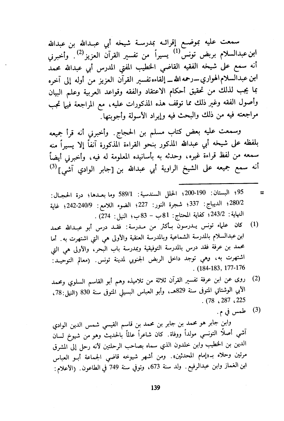 سَمِعت عَلَيْهِ بِموضع إقرائه بمدرسة شَيْخه أبي عبد الله بن عبد الله ابْن عبد السَّلَام بربض تونس يَسِيرا من تَفْسِير الْقُرْآن الْعَزِيز وَأَخْبرنِي أَنه سمع على شَيْخه الْفَقِيه القَاضِي الْخَطِيب الْمُفْتِي الْمدرس أبي عبد الله مُحَمَّد ابْن عبد السَّلَام الهواري رَحمَه الله إلقاءه تَفْسِير الْقُرْآن الْعَزِيز من أَوله إِلَى آخِره بِمَا يجب لذَلِك من تَحْقِيق أَحْكَام الِاعْتِقَاد وَالْفِقْه وقواعد الْعَرَبيَّة وَعلم الْبَيَان وأصول الْفِقْه وَغير ذَلِك مِمَّا توقف هَذِه الْمَذْكُورَات عَلَيْهِ مَعَ الْمُرَاجَعَة فِيمَا تجب مُرَاجعَته فِيهِ من ذَلِك والبحث فِيهِ وإيراد الأسولة وأجوبتها