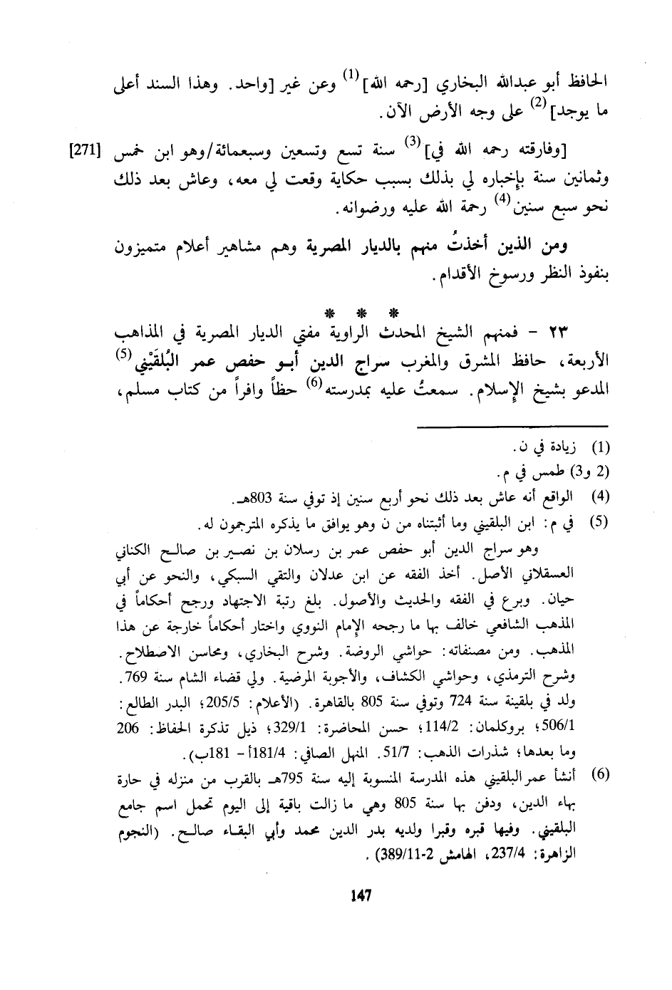 23 - فَمنهمْ الشَّيْخ الْمُحدث الراوية مفتي الديار المصرية فِي الْمذَاهب الْأَرْبَعَة حَافظ الْمشرق وَالْمغْرب سراج الدّين أَبُو حَفْص عمر البُلْقِينِيّ الْمَدْعُو بشيخ الْإِسْلَام سَمِعت عَلَيْهِ بمدرسته حظا وافرا من كتاب مُسلم