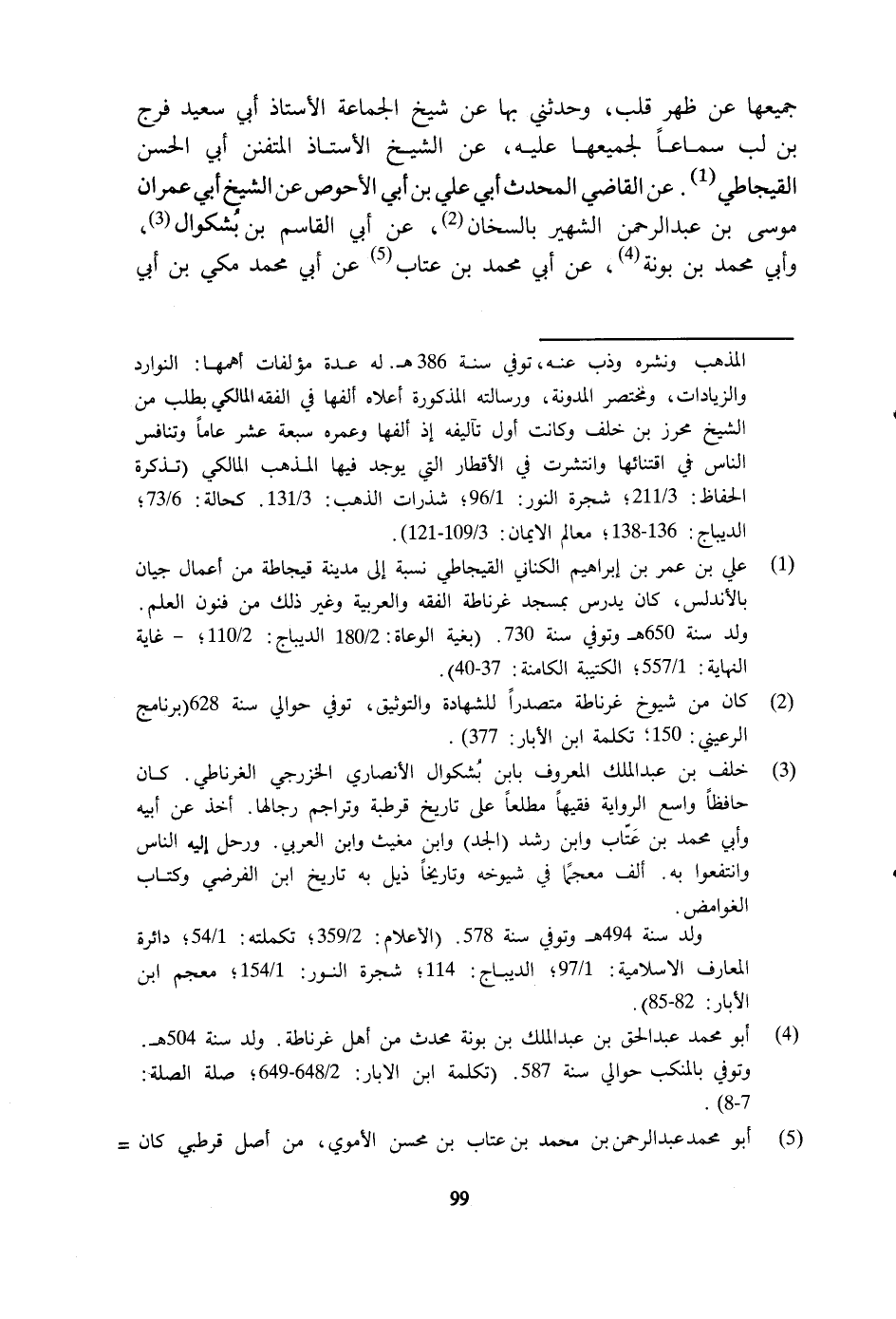 جَمِيعهَا عَن ظهر قلب وحَدثني بهَا عَن شيخ الْجَمَاعَة الْأُسْتَاذ أبي سعيد فرج بن لب سَمَاعا لجميعها عَلَيْهِ عَن الشَّيْخ الْأُسْتَاذ المتفنن أبي الْحسن القيجاطي عَن القَاضِي الْمُحدث أبي عَليّ بن أبي الْأَحْوَص عَن الشَّيْخ أبي عمرَان مُوسَى بن عبد الرَّحْمَن الشهير بالسخان عَن أبي الْقَاسِم بن بشكوال وَأبي مُحَمَّد بن بونة عَن أبي مُحَمَّد بن عتاب عَن أبي مُحَمَّد مكي بن أبي