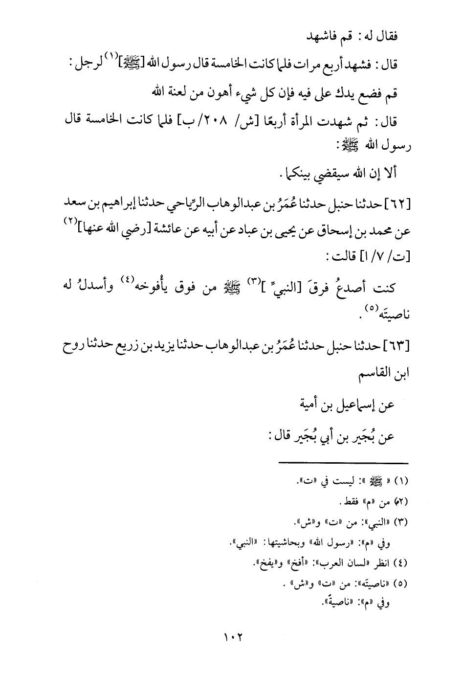 65 - حَدَّثَنَا حَنْبَلٌ، حَدَّثَنَا عُمَرُ بْنُ عَبْدِ الْوَهَّابِ الرِّيَاحِيُّ , حَدَّثَنَا إِبْرَاهِيمُ بْنُ سَعْدٍ , عَنْ مُحَمَّدِ بْنِ إِسْحَاقَ , عَنْ يَحْيَى بْنِ عَبَّادٍ , عَنْ أَبِيهِ , عَنْ عَائِشَةَ رَضِيَ اللَّهُ عَنْهَا , قَالَتْ: «كُنْتُ §أَصْدَعُ فَرْقَ النَّبِي صَلَّى اللهُ عَلَيْهِ وَسَلَّمَ مِنْ فَوْقِ يَأْفُوخِهِ وَأَسْدِلُ لَهُ نَاصِيَتَهُ»