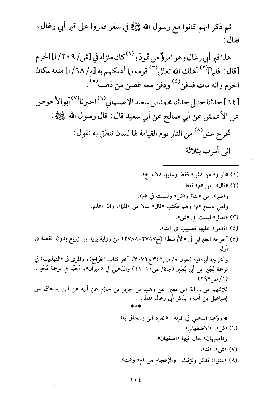 67 - ثُمَّ ذَكَرَ أَنَّهُمْ كَانُوا مَعَ رَسُولِ اللَّهِ صَلَّى اللهُ عَلَيْهِ وَسَلَّمَ فِي سَفَرٍ فَمَرُّوا عَلَى قَبْرِ أَبِي رِغَالٍ , فَقَالَ: «هَذَا قَبْرُ أَبِي رِغَالٍ وَهُوَ امْرُؤٌ مِنْ ثَمُودَ وَكَانَ مَنْزِلُهُ فِي الْحَرَمِ» قَالَ: «§فَلَمَّا أَهْلَكَ اللَّهُ تَعَالَى قَوْمَهُ بِمَا أَهْلَكَهُمْ بِهِ مَنَعَهُ لِمَكَانِ الْحَرَمِ وَأَنْهَ مَاتَ فَدُفِنَ , وَدُفِنَ مَعَهُ غُصْنٌ مِنْ ذَهَبٍ»