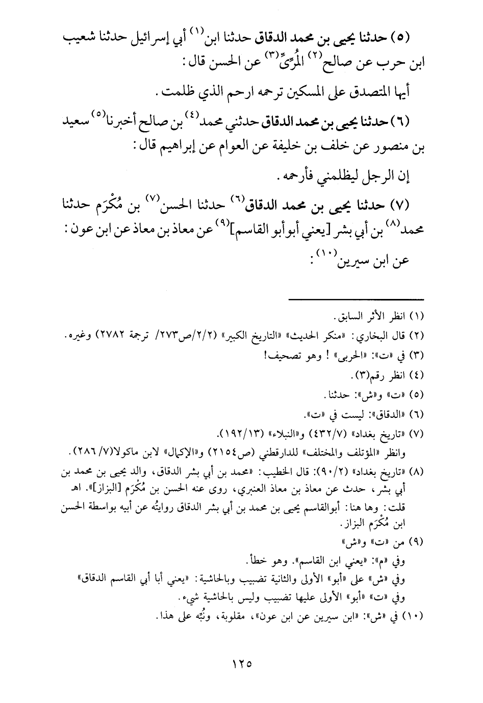 97 - حَدَّثَنَا يَحْيَى بْنُ مُحَمَّدٍ الدَّقَّاقُ , حَدَّثَنَا الْحَسَنُ بْنُ مُكْرَمٍ , حَدَّثَنَا مُحَمَّدُ بْنُ أَبِي بَشِيرٍ يَعْنِي أَبَا الْقَاسِمِ , عَنْ مُعَاذِ بْنِ مُعَاذٍ , عَنِ ابْنِ عَوْنٍ , عَنِ ابْنِ سِيرِينَ -[126]- أَنَّهُ: «§كَرِهَ الْمَصْلَ» حَدَّثَنَا يَحْيَى بْنُ مُحَمَّدٍ الدَّقَّاقُ , حَدَّثَنَا سُرَيْجٌ , حَدَّثَنَا أَزْهَرُ , عَنِ ابْنِ عَوْنٍ , عَنْ مُحَمَّدٍ , مِثْلَهُ
