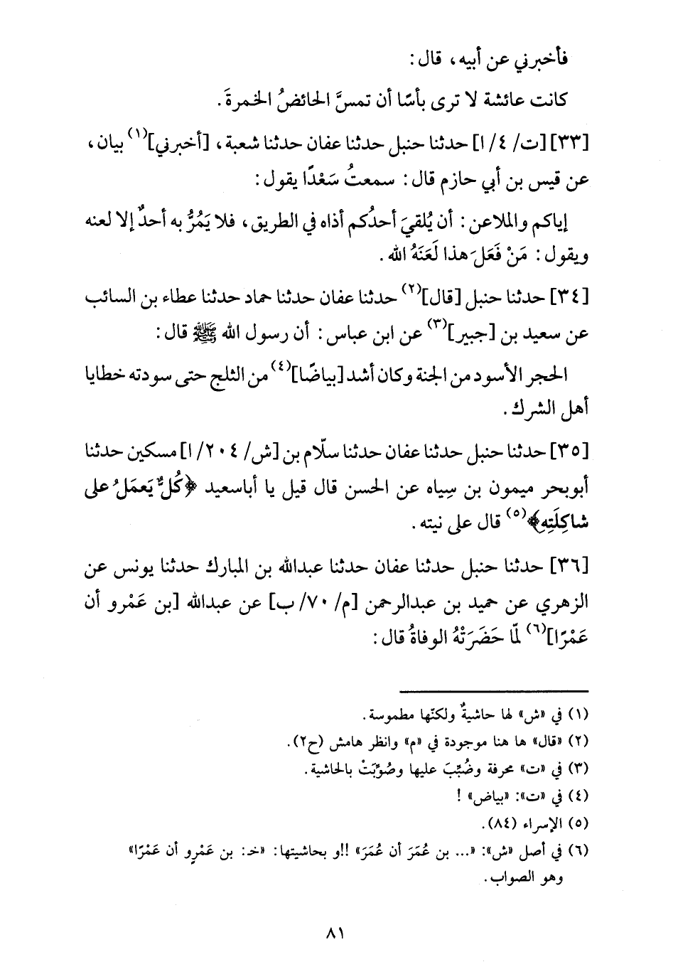 37 - قَالَ: حَدَّثَنَا حَنْبَلٌ قال: حَدَّثَنَا عَفَّانُ , حَدَّثَنَا حَمَّادٌ , حَدَّثَنَا عَطَاءُ بْنُ السَّائِبِ , عَنْ سَعِيدِ بْنِ جُبَيْرٍ , عَنِ ابْنِ عَبَّاسٍ: أَنَّ رَسُولَ اللَّهِ صَلَّى اللهُ عَلَيْهِ وَسَلَّمَ قَالَ: «§الْحَجَرُ الْأَسْوَدُ مِنَ الْجَنَّةِ , وَكَانَ أَشَدَّ بَيَاضًا مِنَ الثَّلْجِ حَتَّى سَوَّدَتْهُ خَطَايَا أَهْلِ الشِّرْكِ»