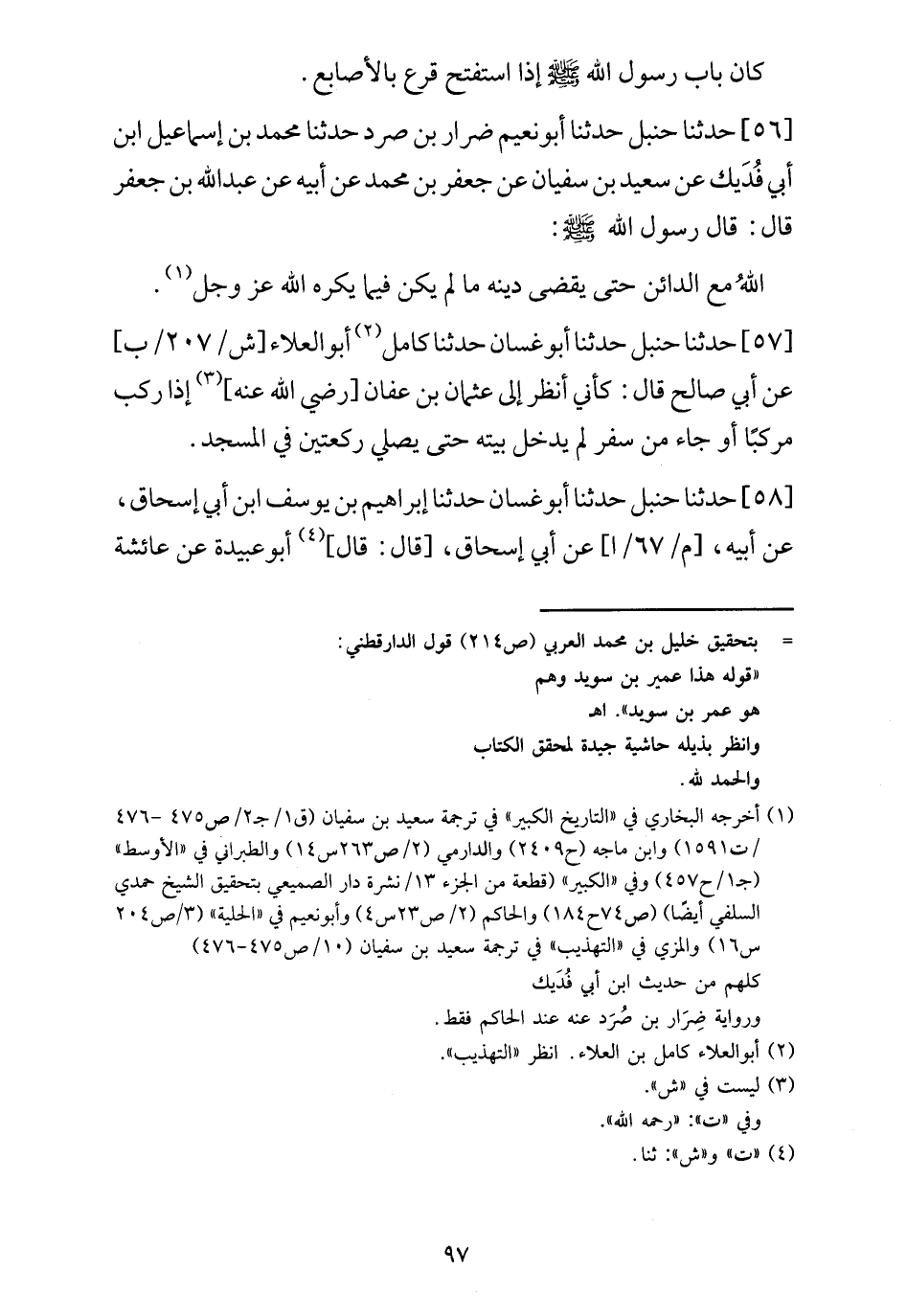 59 - حَدَّثَنَا حَنْبَلٌ، حَدَّثَنَا أَبُو نُعَيْمٍ ضِرَارُ بْنُ صُرَدَ , حَدَّثَنَا مُحَمَّدُ بْنُ إِسْمَاعِيلَ بْنِ أَبِي فُدَيْكٍ , عَنْ سَعِيدِ بْنِ سُفْيَانَ , عَنْ جَعْفَرِ بْنِ مُحَمَّدٍ , عَنْ أَبِيهِ , عَنْ عَبْدِ اللَّهِ بْنِ جَعْفَرٍ , قَالَ: قَالَ رَسُولُ اللَّهِ صَلَّى اللهُ عَلَيْهِ وَسَلَّمَ: «§اللَّهُ مَعَ الدَّائِنِ حَتَّى يَقْضِي دِينَهُ , مَا لَمْ يَكُنْ فِيمَا يَكْرَهُ اللَّهُ عَزَّ وَجَلَّ»