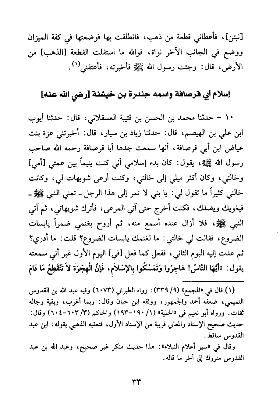 10 - حدثنا محمد بن الحسن بن قتيبة العسقلاني، قال: ثنا أيوب بن علي بن الهيصم، قال: ثنا زياد بن سيار، قال: أخبرتني عزة بنت عياض بن أبي قرصافة أنها سمعت جدها أبا قرصافة، صاحب رسول الله، صلى الله عليه وسلم يقول: كان بدء إسلامي أني كنت يتيما بين أمي وخالتي، وكان أكثر ميلي إلى خالتي، وكنت أرعى شويهات لي، وكانت خالتي كثيرا ما تقول لي: يا بني، لا تمر إلى هذا الرجل، تعني رسول الله صلى الله عليه وسلم فيغويك ويضلك، فكنت أخرج حتى آتي المرعى، فأترك شويهاتي ثم آتي النبي صلى الله عليه وسلم، فلا أزال عنده أسمع منه، ثم أروح بغنمي ضمرا يابسات الضروع، وقالت لي خالتي: ما لغنمك يابسات الضروع؟ قلت: ما أدري، ثم عدت إليه اليوم الثاني، ففعل كما فعل في اليوم الأول، غير أني سمعته يقول: " أيها الناس، هاجروا وتمسكوا بالإسلام؛ فإن الهجرة لا تنقطع ما دام @