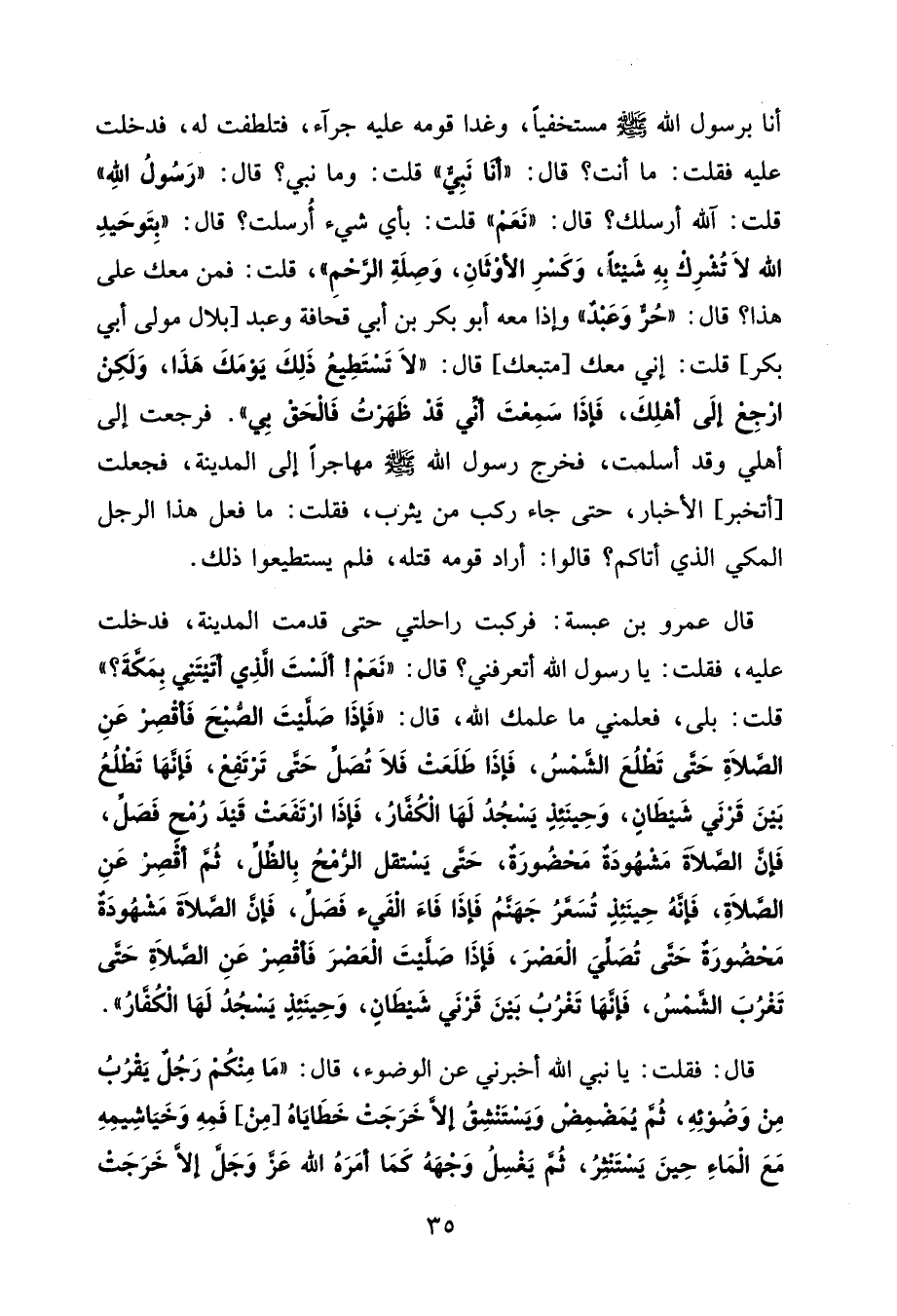 أنا برسول الله صلى الله عليه وسلم مستخفيا، وإذا قومه عليه جرآء، فتلطفت له فدخلت عليه، فقلت: ما أنت؟ قال: " أنا نبي "، قلت: وما نبي؟ قال: " رسول الله "، قلت: الله أرسلك؟ قال: " نعم "، قلت: " بأي شيء أرسلت؟ قال: " بتوحيد الله، لا تشرك به شيئا، وكسر الأوثان، وصلة الرحم "، قلت: فمن معك على هذا؟ قال: " حر وعبد " وإذا معه أبو بكر بن أبي قحافة وعبد بلال مولى أبي بكر، قلت: إني معك متبعك، قال: " لا تستطيع ذلك يومك هذا، ولكن ارجع إلى أهلك، فإذا سمعت أني قد ظفرت فالحق بي "، فرجعت إلى أهلي وقد أسلمت، فخرج رسول الله صلى الله عليه وسلم مهاجرا إلى المدينة، فجعلت أتخبر الأخبار حتى جاء ركب من يثرب، فقلت: ما فعل هذا الرجل المكي الذي أتاكم؟ قالوا: أراد قومه قتله فلم يستطيعوا ذلك، وحيل بينهم وبينه، فركب الناس إليه سراعا. قال عمرو بن عبسة، فركبت راحلتي حتى قدمت المدينة، فدخلت عليه فقلت: يا رسول الله، أتعرفني؟ قال: " نعم، ألست الذي أتيتني بمكة؟ " قلت: بلى، فعلمني ما علمك الله، قال: " فإذا صليت الصبح فأقصر عن الصلاة حتى تطلع الشمس، فإذا طلعت فلا تصل حتى ترتفع؛ فإنها تطلع بين قرني شيطان، وحينئذ يسجد لها الكفار، فإذا ارتفعت قيد رمح فصل، فإن الصلاة مشهودة لحضوره، حتى يستقل الرمح بالظل، ثم أقصر عن الصلاة، فإنها حينئذ تسعر جهنم، فإذا فاء الفيء فصل، فإن الصلاة مشهودة محضورة حتى تصلي العصر، فإذا صليت العصر فأقصر عن الصلاة حتى تغرب الشمس؛ فإنها تغرب بين قرني شيطان، وحينئذ يسجد لها الكفار "، قال: فقلت: يا نبي الله، أخبرني عن الوضوء، قال: " ما منكم رجل يقرب من وضوئه ثم يمضمض ويستنشق إلا خرجت خطاياه من فمه وخياشيمه مع الماء حين يستنثر، ثم يغسل وجهه كما أمره الله عز وجل إلا خرجت@