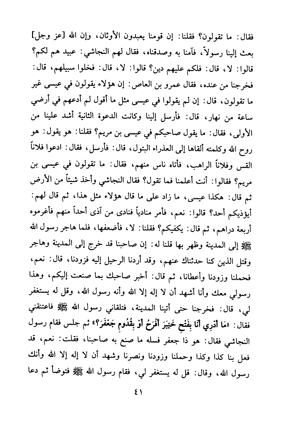 فقال: ما تقولون؟ قلنا: إن قومنا يعبدون الأوثان، وإن الله عز وجل بعث إلينا رسولا فآمنا به وصدقناه، فقال لهم النجاشي: عبيد هم لكم؟ قالوا: لا، قال: فلكم عليهم دين؟ قالوا: لا، قال: فخلوا سبيلهم، فخرجنا من عنده، فقال عمرو بن العاص: إن هؤلاء يقولون في عيسى غير ما تقولون، قال: إن لم يقولوا في عيسى مثل ما أقول لم أدعهم في أرضي ساعة من نهار، قال: فأرسل إلينا وكانت الدعوة الثانية أشد علينا من الأولى، فقال: ما يقول صاحبكم في عيسى ابن مريم؟ فقلنا: يقول: " هو روح الله وكلمته ألقاها إلى العذراء البتول "، قال: فأرسل فقال: ادعوا فلانا القس وفلانا الراهب، فأتاه ناس منهم، فقال: ما تقولون في عيسى ابن مريم، قالوا: أنت أعلمنا فما تقول؟ فقال النجاشي وأخذ شيئا من الأرض ثم قال: هكذا عيسى، ما زاد على ما قال هؤلاء مثل هذا، ثم قال لهم: أيؤذيكم أحد؟ قالوا: نعم، فأمر مناديا فنادى: من آذى أحدا منهم فأغرموه أربعة دراهم، ثم قال: يكفيكم؟ فقلنا: لا، فأضعفها، فلما هاجر رسول الله صلى الله عليه وسلم إلى المدينة وظهر بها قلنا له: إن صاحبنا خرج إلى المدينة وهاجر وقتل الذين كنا حدثناك عنهم، وقد أردنا الرحيل فزودنا، قال: نعم، فحملنا وزودنا وأعطانا، ثم قال: أخبر صاحبك بما صنعت إليكم، وهذا رسولي معك، وأنا أشهد أن لا إله إلا الله، وأنه رسول الله، وقل له يستغفر لي، قال: فخرجنا حتى أتينا المدينة فتلقاني رسول الله صلى الله عليه وسلم فاعتنقني فقال: " ما أدري أنا بفتح خيبر أفرح أو بقدوم جعفر " فسله ما صنع به صاحبنا، فقلت: نعم، قد فعل بنا قد فعل كذا وكذا، وحملنا، وزودنا، ونصرنا، وشهد أن لا إله إلا الله، وأنك رسوله، وقال: قل له يستغفر لي، فقام رسول الله صلى الله عليه وسلم فتوضأ ثم دعا @