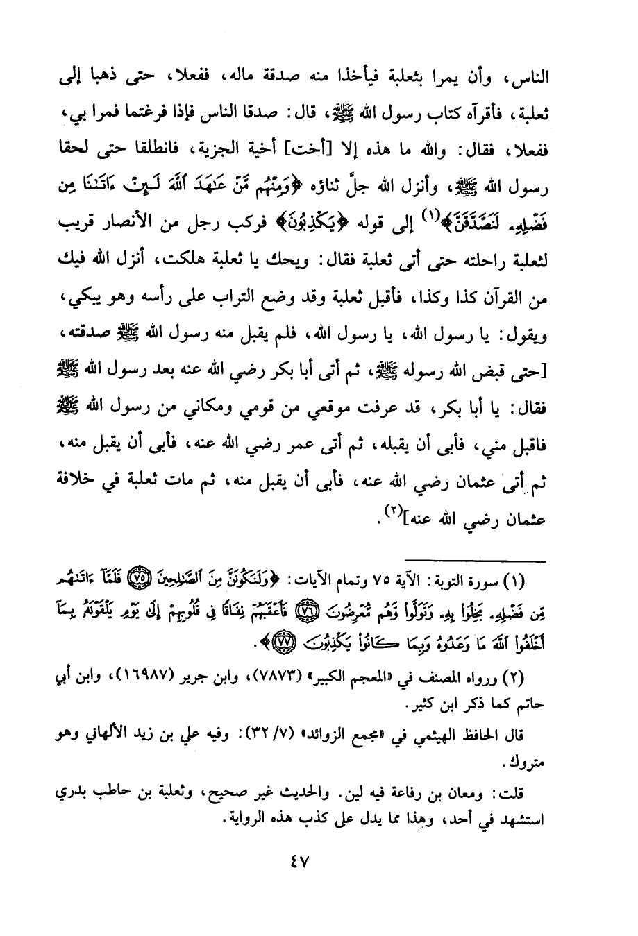 الناس، وأن يمرا بثعلبة فيأخذا منه صدقة ماله، ففعلا، حتى ذهبا إلى ثعلبة فأقرآه كتاب رسول الله صلى الله عليه وسلم، قال: صدقا الناس فإذا فرغتما فمرا بي، ففعلا، فقال: والله ما هذه إلا أخية الجزية، فانطلقا حتى لحقا رسول الله صلى الله عليه وسلم، وأنزل الله جل ثناؤه {ومنهم من عاهد الله لئن آتانا من فضله لنصدقن} [التوبة: 75] إلى قوله {يكذبون} [التوبة: 77] فركب رجل من الأنصار قريب لثعلبة راحلته حتى أتى ثعلبة، فقال: ويحك يا ثعلبة هلكت، أنزل الله فيك من القرآن كذا وكذا، فأقبل ثعلبة وقد وضع التراب على رأسه وهو يبكي ويقول: يا رسول الله، يا رسول الله، فلم يقبل منه رسول الله صلى الله عليه وسلم صدقته حتى قبض الله رسوله صلى الله عليه وسلم، ثم أتى أبا بكر رضي الله عنه بعد رسول الله صلى الله عليه وسلم فقال: يا أبا بكر قد عرفت موقعي من قومي ومكاني من رسول الله صلى الله عليه وسلم فاقبل مني فأبى أن يقبله، ثم أتى عمر رضي الله عنه فأبى أن يقبل منه، ثم أتى عثمان رضي الله عنه فأبى أن يقبل منه، ثم مات ثعلبة في خلافة عثمان رضي الله عنه "@