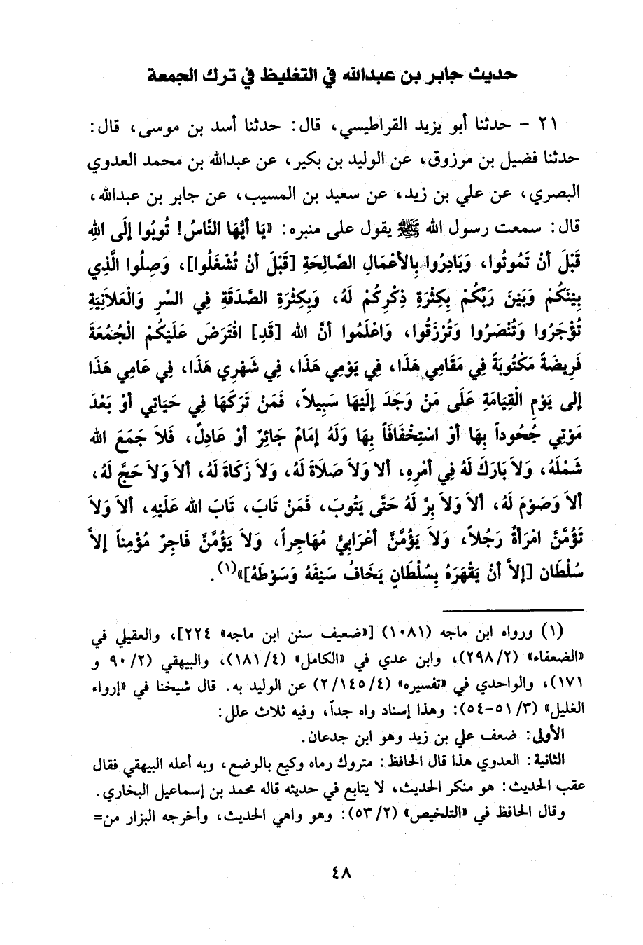 21 - حدثنا أبو يزيد القراطيسي، ثنا أسد بن موسى، ثنا فضيل بن مرزوق، عن الوليد بن بكير، عن عبد الله بن محمد العدوي البصري، عن علي بن زيد، عن سعيد بن المسيب، عن جابر بن عبد الله قال: سمعت رسول الله صلى الله عليه وسلم، يقول على منبره: " يا أيها الناس، توبوا إلى الله قبل أن تموتوا، وبادروا بالأعمال الصالحة قبل أن تشغلوا، وصلوا الذي بينكم وبين ربكم بكثرة ذكركم له، وبكثرة الصدقة في السر والعلانية تؤجروا وتنصروا وترزقوا، واعلموا أن الله قد افترض عليكم الجمعة فريضة مكتوبة في مقامي هذا، في يومي هذا، وفي شهري هذا، في عامي هذا إلى يوم القيامة على من وجد إليها سبيلا، فمن تركها في حياتي أو بعد موتي جحودا بها، أو استخفافا بها، وله إمام جائر أو عادل، فلا جمع الله شمله، ولا بارك له في أمره، ألا ولا صلاة له، ولا زكاة له، ألا ولا حج له، ألا ولا صوم له، ألا ولا بر له حتى يتوب، فمن تاب تاب الله عليه، ألا ولا تؤمن امرأة رجلا، ولا يؤمن أعرابي مهاجرا، ولا يؤمن فاجر مؤمنا، إلا سلطان إلا أن يقهره بسلطان، يخاف سيفه وسوطه "@