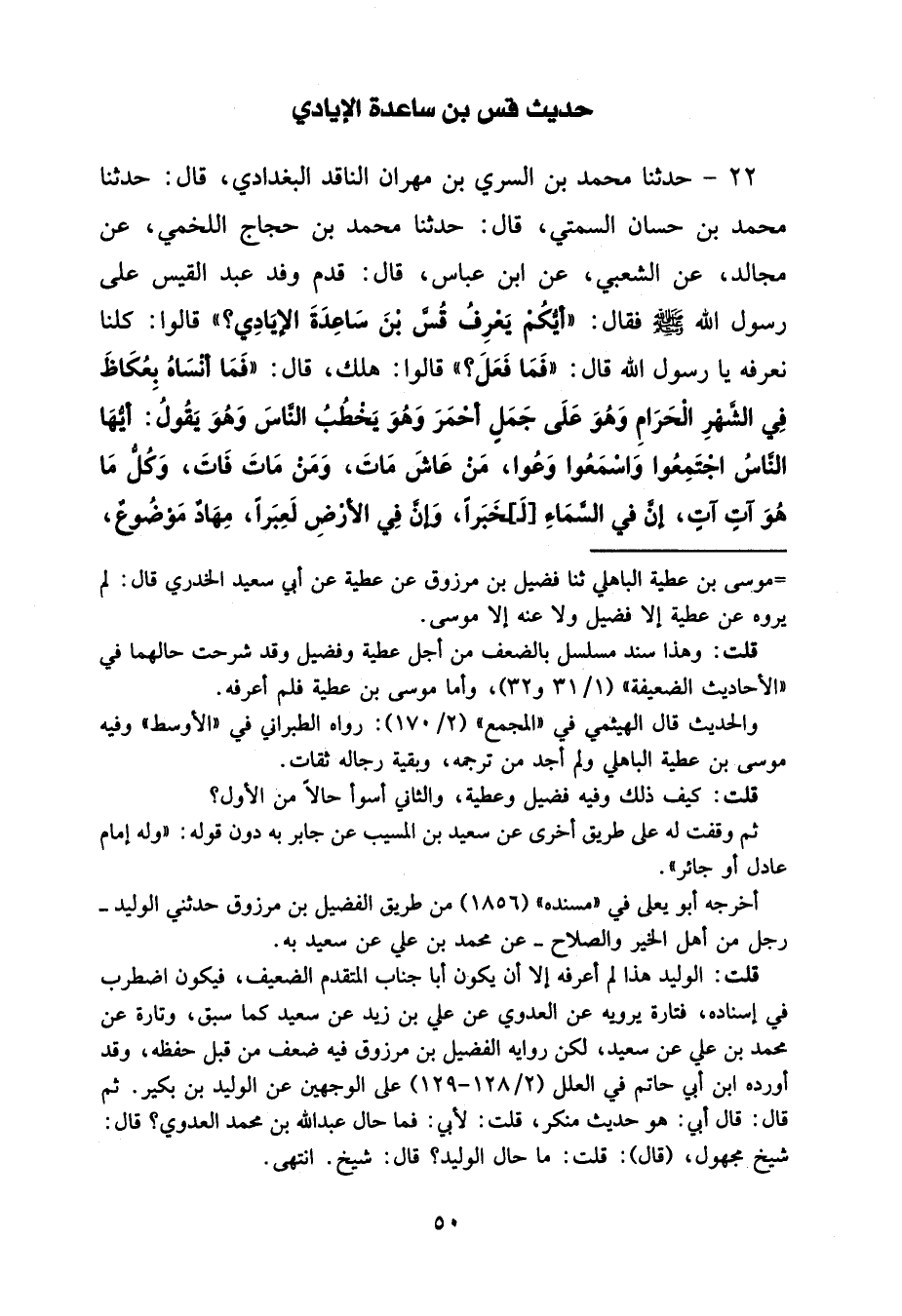 22 - حدثنا محمد بن السري بن مهران الناقد البغدادي، ثنا محمد بن حسان السمتي، ثنا محمد بن حجاج اللخمي، عن مجالد، عن الشعبي، عن ابن عباس، قال: قدم وفد عبد القيس على رسول الله صلى الله عليه وسلم، فقال:" أيكم يعرف قس بن ساعدة الإيادي؟ " قالوا: كلنا نعرفه يا رسول الله، قال:" فما فعل" قالوا: هلك، قال:" فما أنساه بعكاظ في الشهر الحرام وهو على جمل أحمر وهو يخطب الناس، ويقول: أيها الناس، اجتمعوا واسمعوا وعوا، من عاش مات، ومن مات فات، وكل ما هو آت آت، إن في السماء لخبرا، وإن في الأرض لعبرا، مهاد موضوع،@