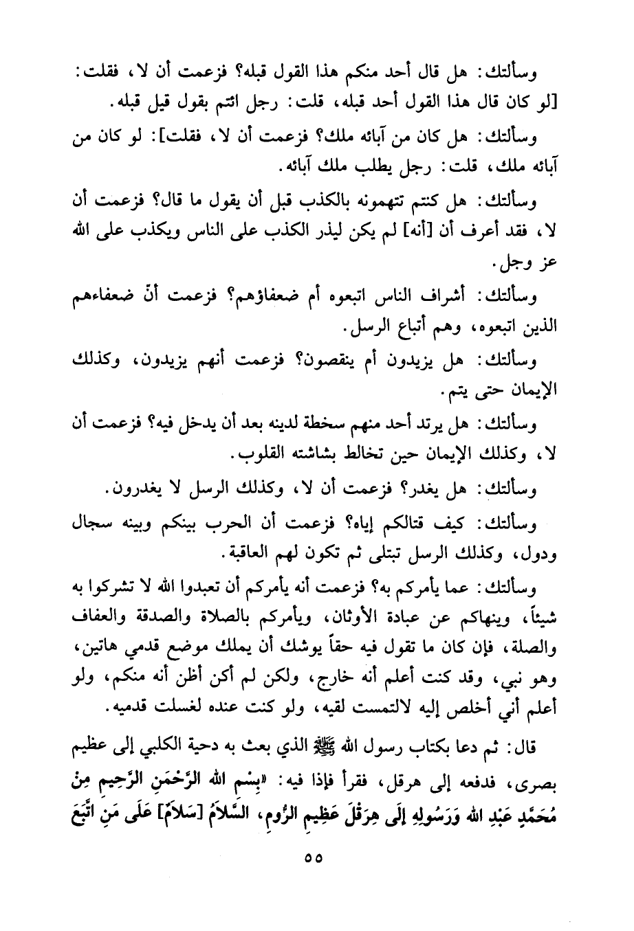 وسألتك: هل قال أحد منكم هذا القول قبله؟ فزعمت أن لا، فقلت: لو كان قال هذا القول أحد قبله قلت: رجل ائتم بقول قيل قبله، وسألتك: هل كان من آبائه ملك؟ فزعمت أن لا، فقلت: لو كان من آبائه ملك قلت: رجل يطلب ملك آبائه، وسألتك: هل كنتم تتهمونه بالكذب قبل أن يقول ما قال؟ فزعمت أن لا، فقد أعرف أنه لم يكن ليذر الكذب على الناس ويكذب على الله، وسألتك: أشراف الناس اتبعوه أم ضعفاؤهم؟ فزعمت أن ضعفاءهم الذين اتبعوه، وهم أتباع الرسل، وسألتك هل يزيدون أم ينقصون؟ فزعمت أنهم يزيدون، وكذلك الإيمان حتى يتم، وسألتك: هل يرتد أحد منهم سخطة لدينه بعد أن يدخل فيه؟ فزعمت أن لا، وكذلك الإيمان حين يخالط بشاشة القلوب، وسألتك: هل يغدر، فزعمت أن لا، وكذلك الرسل لا يغدرون، وسألتك: كيف قتالكم إياه؟ فزعمت أن الحرب بينكم سجال ودول، وكذلك الرسل تبتلى ثم تكون لهم العاقبة، وسألتك عما يأمركم به، فزعمت أنه يأمركم أن تعبدوا الله، ولا تشركوا به شيئا، وينهاكم عن عبادة الأوثان، ويأمركم بالصلاة، والصدقة، والعفاف والصلة، فإن كان ما تقول حقا يوشك أن يملك موضع قدمي هاتين، وهو نبي، وقد كنت أعلم أنه خارج، ولكن لم أكن أظن أنه منكم، ولو أعلم أني أخلص إليه لالتمست لقيه ولو كنت عنده لغسلت قدميه. قال: ثم دعا بكتاب رسول الله صلى الله عليه وسلم الذي بعث به دحية الكلبي إلى عظيم بصرى فدفعه إلى هرقل فقرأه فإذا فيه: " بسم الله الرحمن الرحيم من محمد عبد الله ورسوله إلى هرقل عظيم الروم، سلام على من اتبع @