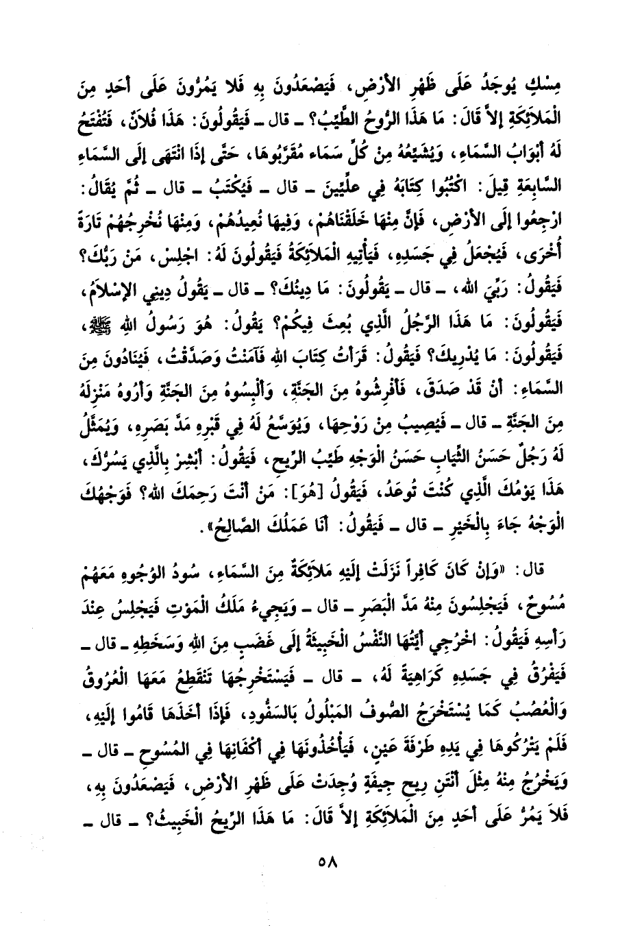 مسك يوجد على وجه الأرض، يتصعدون به فلا يمرون على أحد من الملائكة إلا قال: ما هذا الروح الطيب؟ قال: فيقولون: هذا فلان، فتفتح أبواب السماء، ويشيعه من كل سماء مقربوها، حتى إذا انتهى إلى السماء السابعة قيل: اكتبوا كتابه في العليين: قال: فيكتب، قال: ثم يقال: أرجعوه إلى الأرض؛ فإن منها خلقناهم، وفيها نعيدهم، ومنها نخرجهم تارة أخرى، فيجعل في جسده، فيأتيه الملائكة فيقولون له: اجلس، من ربك؟ فيقول: ربي الله، قال: يقولون: ما دينك؟ قال: يقول: ديني الإسلام، فيقولون: ما هذا الرجل الذي بعث فيكم؟ يقول: هو رسول الله صلى الله عليه وسلم، فيقولون: ما يدريك؟ فيقول: قرأت كتاب الله فآمنت وصدقت، فينادون من السماء: أن قد صدق، فأفرشوه من السماء، وألبسوه من الجنة، وأروه منزله من الجنة، قال: فيصيب من روحها، ويوسع له في قبره مد بصره، ويمثل له رجل حسن الثياب، طيب الريح، فيقول: أبشر بالذي يسرك، هذا يومك الذي كنت توعد، فيقول هو: من أنت رحمك الله؟ فوجهك الذي جاء بالخير، قال: فيقول: أنا عملك الصالح ". قال: " وإن كان كافرا نزلت إليه ملائكة من السماء، سود الوجوه معهم مسوح فيجلسون منه مد البصر، قال: ويجيء ملك الموت فيجلس عند رأسه فيقول: اخرجي أيتها النفس الخبيثة إلى غضب من الله وسخطه، قال: فيفرق في جسده كراهية له، قال: فيستخرجها تنقطع معها العروق والعصب كما يستخرج الصوف المبلول بالسفود، فإذا أخذها قاموا إليه فلم يتركوها في يده طرفة عين، فيأخذونها في أكفانها في المسوح، قال: ويخرج منه مثل أنتن ريح جيفة وجدت على وجه الأرض، ويصعدون بها، فلا يمر على أحد من الملائكة إلا قال: ما هذا الروح الخبيث؟ @