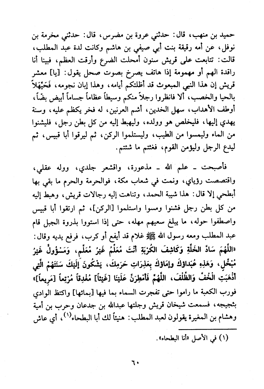 حميد بن منهب قال: حدثني عروة بن مضرس قال: حدثني مخرمة بن نوفل، عن أمه رقيقة بنت أبي صيفي بن هاشم وكانت لدة عبد المطلب قالت: تتابعت على قريش سنون أمحلت الضرع وأدقت العظم، فبينا أنا راقدة الهم أو مهمومة إذا هاتف يصرخ بصوت صحل يقول: يا معشر قريش، إن هذا النبي المبعوث قد أظلتكم أيامه، وهذا إبان نجومه فحيهلا بالحياء والخصب، ألا فأنفروا رجلا منكم وسيطا، عظاما، جساما، أبيض بضياء، أوطف الأهداب، سهل الخدين، أشم العرنين، له فخر يكظم عليه، وسنة يهدي إليها، فليخلص هو وولده، وليهبط إليه من كل بطن رجل، فليشنوا من الماء، وليمسوا من الطيب، وليستلموا الركن، ثم ليرقوا أبا قبيس، ثم ليدع الرجل وليؤمن القوم، فغثتم ما شئتم. فأصبحت علم الله مذعورة، واقشعر جلدي، ووله عقلي، واقتصصت رؤياي، ونمت في شعاب مكة فوالحرمة والحرم ما بقي بها أبطحي إلا قال: هذا شيبة الحمد، وتناهت إليه رجالات قريش، وهبط إليه من كل بطن رجل، فشنوا، ومسوا، واستلموا الركن، ثم ارتقوا أبا قبيس واصطفوا حوله ما يبلغ سعيهم مهلة، حتى إذا استووا بذروة الجبل قام عبد المطلب ومعه رسول الله صلى الله عليه وسلم، غلام قد أيفع أو كرب فرفع يديه، وقال: اللهم ساد الخلة، وكاشف الكربة، أنت معلم غير معلم، ومسؤول غير مبخل، وهذه عبداؤك وإماؤك بعذرات حرمك، يشكون إليك سنتهم، أذهبت الخف والظلف، اللهم فأمطر علينا غيثا مغدقا مريعا، فورب الكعبة ما راموا حتى تفجرت السماء بما فيها بمائها، واكتظ الوادي بثجيجه، فسمعت شيخان قريش وجلتها عبد الله بن جدعان وحرب بن أمية وهشام بن المغيرة يقولون لعبد المطلب: هنيئا لك يا أبا البطحاء، أي عاش@
