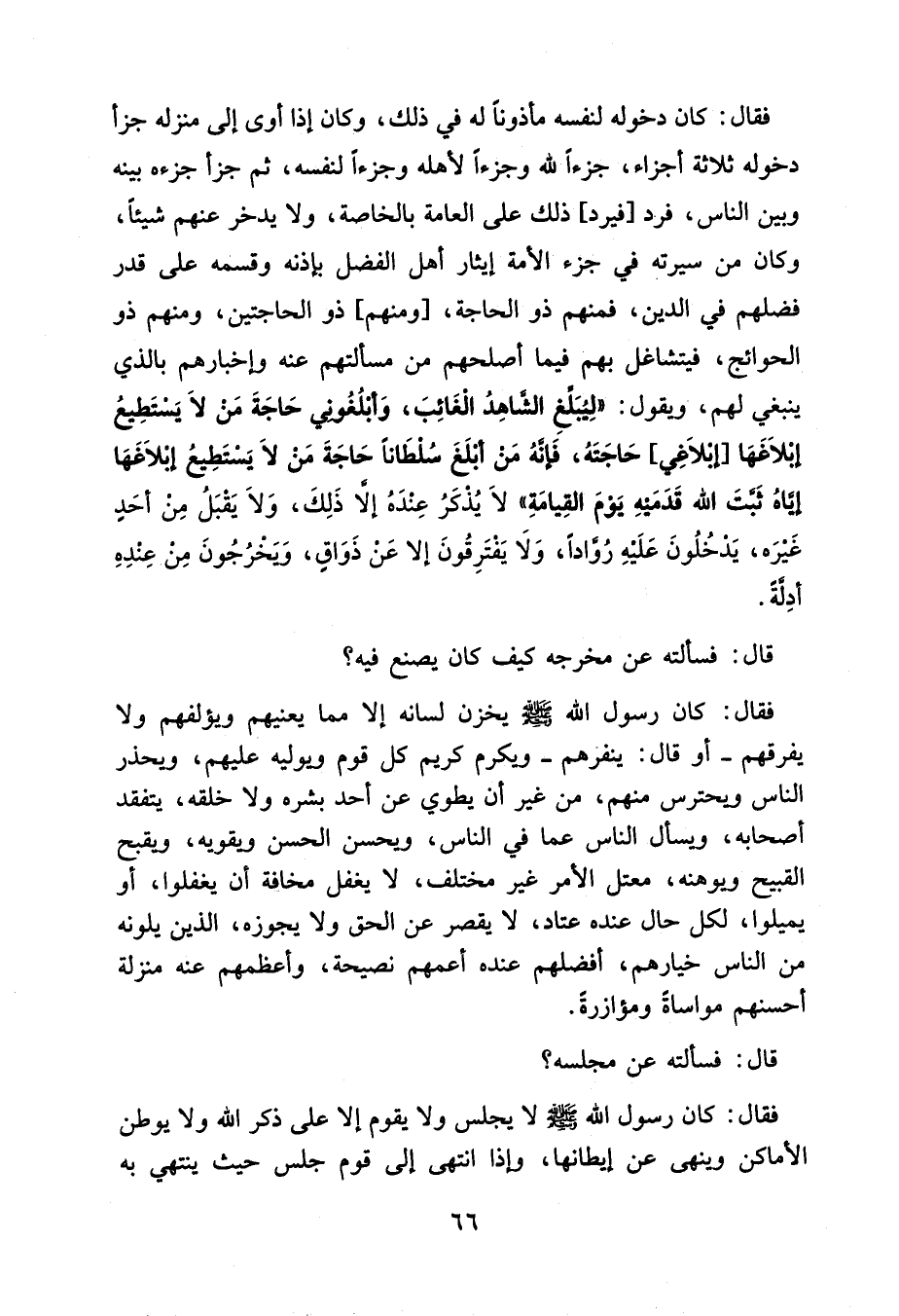 فقال: " كان دخوله لنفسه مأذونا له في ذلك، وكان إذا أوى إلى منزله جزأ دخوله ثلاثة أجزاء: جزء لله، وجزء لنفسه، وجزء لأهله، ثم جزأ جزءه بينه وبين الناس، فيرد ذلك على العامة بالخاصة، ولا يدخر عنهم شيئا، وكان من سيرته في جزء الأمة إيثار أهل الفضل بإذنه وقسمه على قدر فضلهم في الدين، فمنهم ذو الحاجة، ومنهم ذو الحاجتين، ومنهم ذو الحوائج، فيتشاغل بهم فيما أصلحهم والأمة عن شيء سألهم عنه وإخبارهم بالذي ينبغي لهم، ويقول: " ليبلغ الشاهد الغائب، وأبلغوني حاجة من لا يستطيع إبلاغ حاجته، وإنه من أبلغ سلطانا حاجة من لا يستطيع إبلاغها إياه، ثبت الله قدميه يوم القيامة " لا يذكر عنده إلا ذلك، ولا يقبل من أحد غيره، يدخلون عليه روادا ولا يفترقون إلا عن ذواق، ويخرجون من عنده أدلة ". قال: فسألته عن مخرجه كيف كان يصنع فيه؟ فقال: " كان رسول الله صلى الله عليه وسلم يخزن لسانه إلا مما يعينهم ويؤلفهم، ولا يفرقهم، ولا ينفرهم، ويكرم كريم كل قوم ويوليه عليهم، ويحذر الناس ويحترس منهم من غير أن يطوي عن أحد بشره ولا خلقه، يتفقد أصحابه، ويسأل الناس عما في الناس، ويحسن الحسن ويقويه، ويقبح القبيح ويوهنه، معتدل الأمر غير مختلف، لا يغفل مخافة أن يغفلوا أو يميلوا، لكل حال عنده عتاد، لا يقصر عن الحق ولا يجوزه، الذين يلونه من الناس خيارهم، أفضلهم عنده أعمهم نصيحة، وأعظمهم عنده منزلة أحسنهم مواساة ومؤازرة ". قال فسألته عن مجلسه، قال: " كان رسول الله صلى الله عليه وسلم لا يجلس ولا يقوم إلا على ذكر الله، ولا يوطن الأماكن، وينهى عن إيطانها، وإذا انتهى إلى قوم جلس حيث ينتهي به @