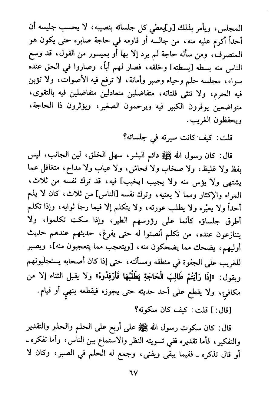 المجلس، ويأمر بذلك، ويعطي كل جلسائه بنصيبه، لا يحسب جليسه أن أحدا أكرم عليه منه، من جالسه أو قاومه في حاجة صابره حتى يكون هو المنصرف، ومن سأله حاجة لم يرد إلا بها أو بميسور من القول، قد وسع الناس منه بسطته وخلقه، فصار لهم أبا، وصاروا في الحق عنده سواء، مجلسه مجلس حلم، وحياء، وصبر، وأمانة، لا ترفع فيه الأصوات، ولا تؤبن فيه الحرم، ولا تنثى فلتاته، متفاضلين، متعادلين فيه بالتقوى، متواضعين، يوقرون الكبير، ويرحمون الصغير، ويؤثرون ذا الحاجة، ويحفظون الغريب ". قلت: كيف كانت سيرته في جلسائه، قال: " كان رسول الله دائم البشر، سهل الخلق، لين الجانب، ليس بفظ، ولا غليظ، ولا صخاب، ولا فحاش، ولا غياب، ولا مداح، متغافل عما لا يشتهي، ولا يوئس منه، ولا يخيب فيه، قد ترك نفسه من ثلاث: المراء، والإكثار، ومما لا يعنيه، وترك الناس من ثلاث: كان لا يذم أحدا، ولا يعيره، ولا يطلب عورته، ولا يتكلم إلا فيما رجا ثوابه، وإذا تكلم أطرق جلساؤه كأنما على رءوسهم الطير، وإذا سكت تكلموا، ولا يتنازعون عنده، من تكلم أنصتوا له حتى يفرغ، حديثهم عنده حديث أوليتهم، يضحك مما يضحكون منه، ويتعجب مما يتعجبون منه، ويصبر للغريب على الجفوة في منطقه ومسألته، حتى إذا كان أصحابه ليستجلبونهم، ويقول: " إذا رأيتم طالب الحاجة يطلبها فأرشدوه "، ولا يقبل الثناء إلا من مكافئ، ولا يقطع على أحد حديثه حتى يجوزه فيقطعه بنهي أو قيام ". قلت: كيف كان سكوته؟ قال: " كان سكوت رسول الله صلى الله عليه وسلم على أربع: على الحلم، والحذر، والتقدير، والتفكر، فأما تقديره ففي تسويته النظر والاستماع بين الناس، وأما تفكره أو قال: تذكره ففيما يبقى ويفنى، وجمع له الحلم في الصبر، وكان لا@