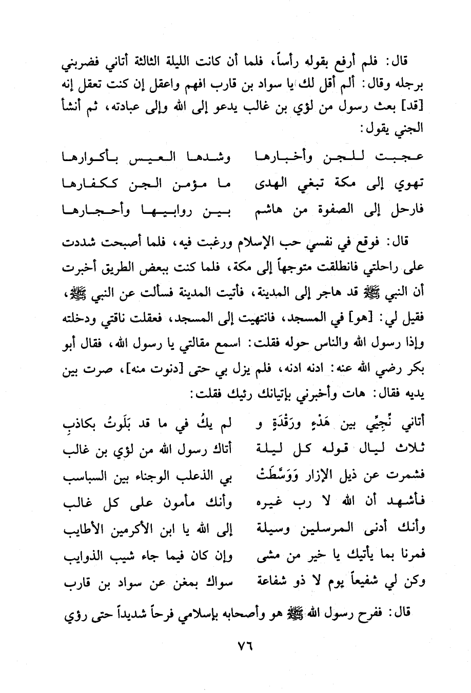 قال: فلم أرفع بقوله رأسا، فلما أن كانت الليلة الثالثة أتاني فضربني برجله وقال: ألم أقل لك يا سواد بن قارب افهم واعقل إن كنت تعقل، إنه قد بعث رسول من لؤي بن غالب يدعو إلى الله وعبادته، ثم أنشأ الجني يقول: