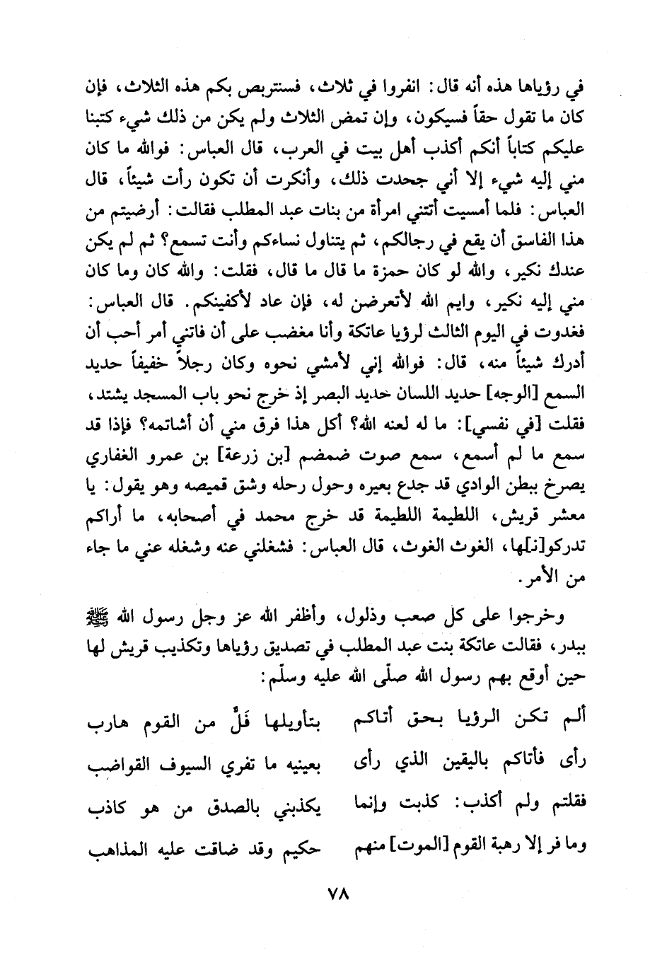 في رؤياها هذه أنه قال: انفروا لثلاث، فسنتربص بكم هذه الثلاث، فإن كان ما تقول حقا فسيكون، وإن تمض الثلاث ولم يكن من ذلك شيء كتبنا عليكم كتابا أنكم أكذب أهل بيت في العرب، قال العباس: فوالله ما كان مني إليه شيء إلا أني جحدت ذلك وأنكرت أن تكون رأت شيئا: فلما أمسيت أتتني امرأة من بنات عبد المطلب، فقالت: أرضيتم من هذا الفاسق أن يقع في رجالكم ثم يتناول نساءكم وأنت تسمع، ثم لم يكن عندك نكير، والله لو كان حمزة ما قال ما قال، فقلت: والله كان، وما كان مني إليه نكير، وأيم الله لأتعرضن له، فإن عاد لأكفينكم، قال العباس: فغدوت في اليوم الثالث لرؤيا عاتكة وأنا مغضب على أن فاتني أمر، وأحب أن أدرك شيئا منه، فقال: والله إني لأمشي نحوه، وكان رجلا خفيفا، حديد الوجه، حديد البصر، حديد اللسان، إن خرج من باب المسجد يشتد، فقلت في نفسي: ما له لعنه الله، أكل هذا فرق مني أن أشاتمه؟ إذ قد سمع ما لم أسمع، سمع صوت ضمضم بن زرعة بن عمرو الغفاري يصرخ ببطن الوادي، قد جدع بعيره، وحول رداءه، وشق قميصه وهو يقول: يا معشر قريش، قد خرج محمد في أصحابه، ما أراكم تدركونها، الغوث الغوث، قال العباس: فشغلني عنه وشغله عني ما جاء من الأمر، وخرجوا على كل صعب وذلول، وأظفر الله عز وجل رسول الله صلى الله عليه وسلم ببدر، فقالت عاتكة بنت عبد المطلب في تصديق رؤياها وتكذيب قريش لها حين أوقع بهم رسول الله صلى الله عليه وسلم: