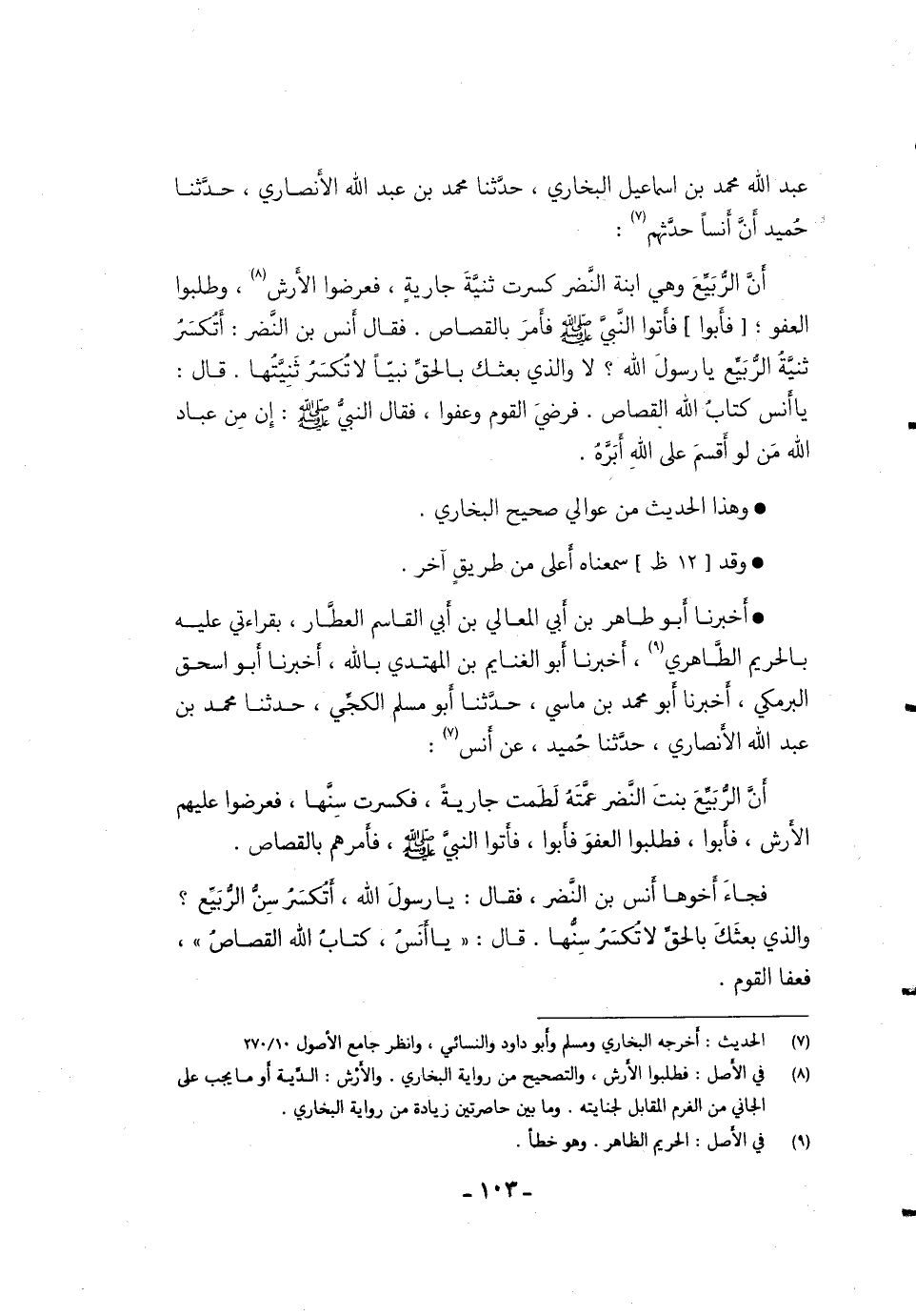 فَجَاءَ أَخُوهَا أَنَسُ بْنُ النَّضْرِ، فَقَالَ: يَا رَسُولَ اللَّهِ، أَتُكْسَرُ سِنُّ الرُّبَيِّعِ؟ وَالَّذِي بَعَثَكَ بِالْحَقِّ لا تُكْسَرُ سِنُّهَا. قَالَ: ((يَا أَنَسُ، كِتَابُ اللَّهِ الْقَصَاصُ)) ، فَعَفَا الْقَوْمُ.
