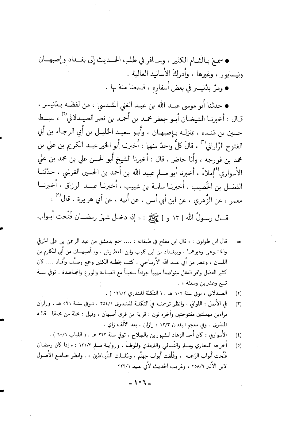 حَدَّثَنَا أَبُو مُوسَى عَبْدُ اللَّهِ بْنُ عَبْدِ الْغَنِيِّ الْمَقْدِسِيُّ، مِنْ لَفْظِهِ بِدُنَيْسَرَ، قَالَ: أَخْبَرَنَا الشَّيْخَانِ أَبُو جَعْفَرٍ مُحَمَّدُ بْنُ أَحْمَدَ بْنِ نَصْرٍ الصَّيْدَلانِيُّ، سِبْطُ حُسَيْنِ بْنِ مَنْدَهٍ، بِمَنْزِلِهِ بِأَصْبَهَانَ، وَأَبُو سَعِيدٍ الْخَلِيلُ بْنُ أَبِي الرَّجَاءِ بْنِ أَبِي الفتوح الراراني، قَالَ كُلُّ وَاحِدٌ مِنْهُمَا: أَخْبَرَنَا أَبُو الْخَيْرِ عَبْدُ الْكَرِيمِ بْنُ عَلِيِّ بْنِ مُحَمَّدِ بْنِ فَوْرَجَةَ، وَأَنَا حَاضِرٌ، قَالَ: أَخْبَرَنَا الشَّيْخُ أَبُو الْحَسَنِ عَلِي بْنُ مُحَمَّدِ بْنِ عَلِيٍّ الأَسْوَارِيُّ إِمْلاءً، أَخْبَرَنَا أَبُو مَسْلِمٍ عُبَيْدُ اللَّهِ بْنُ أَحْمَدَ بْنِ الْحُسَيْنِ الْقُرَشِيُّ، حَدَّثَنَا الْفَضْلُ بْنُ الْخُصَيْبِ، أَخْبَرَنَا سَلَمَةُ بْنُ شَبِيبٍ، أَخْبَرَنَا عَبْدُ الرَّزَّاقِ، أَخْبَرَنَا مَعْمَرٌ، عَنِ الزُّهْرِيِّ، عَنِ ابْنِ أَبِي أَنَسٍ، عَنْ أَبِيهِ، عَنْ أَبِي هُرَيْرَةَ، قَالَ:
