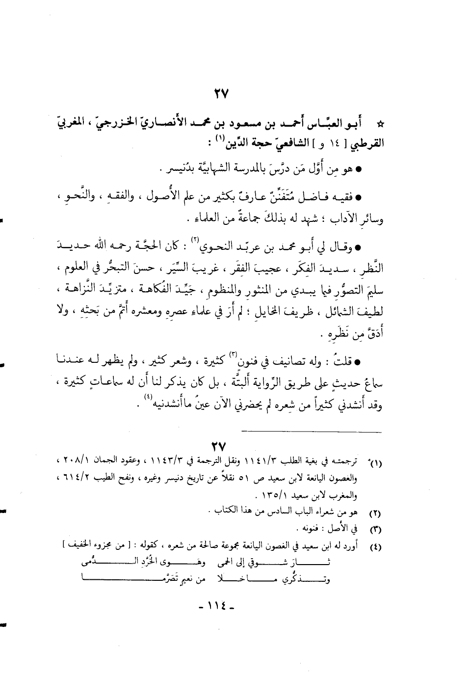 27- أَبُو الْعَبَّاسِ أَحْمَدُ بْنُ مَسْعُودِ بْنِ مُحَمَّدٍ الأَنْصَارِيُّ الْخَزْرَجِيُّ، الْمَغْرِبِيُّ الْقُرْطُبِيُّ الشَّافِعِيُّ حُجَّةُ الدِّينِ: