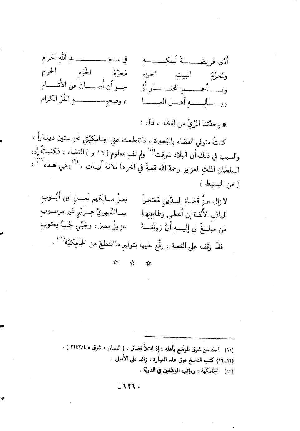 كُنْتُ مُتَوَلِّيَ الْقَضَاءِ بِالْبُحَيْرَةِ، فَانْقَطَعَتْ عَنِّي جَامِكِيَّتِي نَحْو سِتِّينَ دِينَارًا، وَالسَّبَبُ فِي ذَلِكَ أَنَّ الْبِلادَ شَرَقَتْ وَلَمْ تَفِ بِمَعْلُومِ الْقَضَاءِ، فَكَتَبْتُ إِلَى السُّلْطَانِ الْمَلِكِ الْعَزِيزِ رَحِمَهُ اللَّهُ قِصَّةً فِي آخِرِهَا ثَلاثَةُ أَبْيَاتٍ، وَهِيَ هَذِهِ: