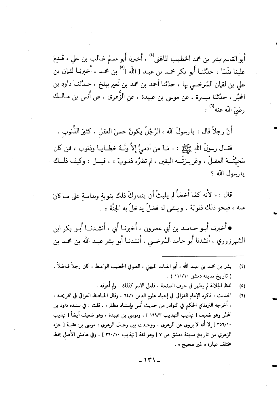 أَبُو الْقَاسِمِ بِشْرُ بْنُ مُحَمَّدٍ الْخَطِيبُ الْمَاهَنِيُّ، أَخْبَرَنَا أَبُو مُسْلِمٍ غَالِبُ بْنُ عَلِيٍّ، قَدِمَ عَلَيْنَا بِنَسَا، حَدَّثَنَا أَبُو بَكْرٍ مُحَمَّدُ بْنُ عَبْدِ [اللَّهِ] بْنِ مُحَمَّدِ، أَخْبَرَنَا لُقْمَانُ بْنُ عَلِيِّ بْنِ لُقْمَانَ السَّرْخَسِيُّ بِهَا، حَدَّثَنَا أَحْمَدُ بْنُ مُحَمَّدِ بْنِ نُعَيْمٍ بِبَلْخَ، حَدَّثَنَا دَاوُدُ بْنُ الْمُحَبَّرِ، حَدَّثَنَا مَيْسَرَةُ، عَنْ مُوسَى بْنِ عُبَيْدَةَ، عَنِ الزُّهْرِيِّ، عَنْ أَنَسِ بْنِ مَالِكٍ رَضِيَ اللَّهُ عَنْهُ: