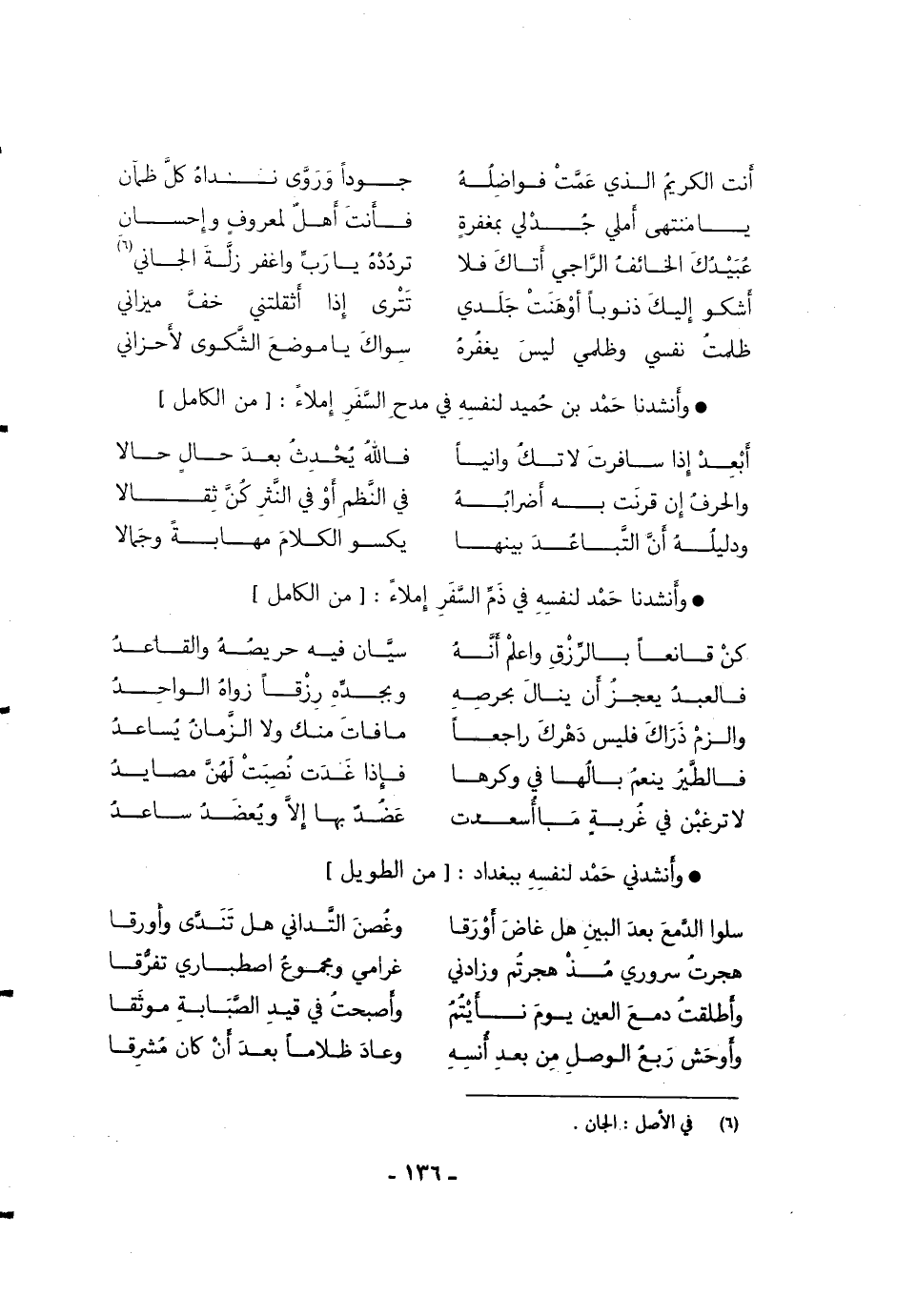 وَأَنْشَدَنَا حَمْدُ بْنُ حُمَيْدٍ لنَفْسِهِ فِي مَدْحِ السفر إملاءً: