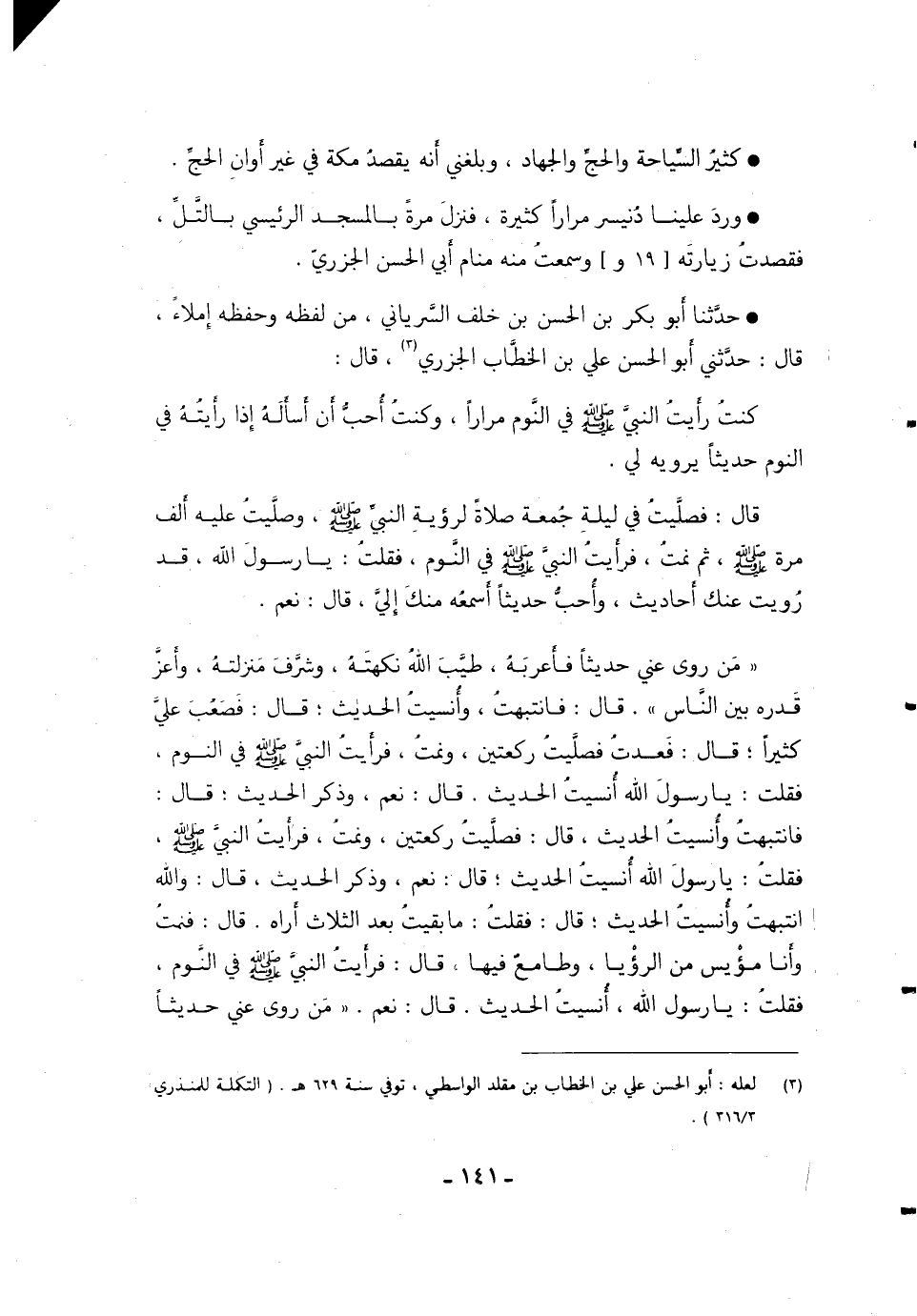 ((مَنْ رَوَى عَنِّي حَدِيثًا فَأَعْرَبَهُ، طَيَّبَ اللَّهُ نَكْهَتَهُ، وَشَرَّفَ مَنْزِلَتَهُ، وَأَعَزَّ قَدْرَهُ بَيْنَ النَّاسِ)) . قَالَ: فَانْتَبَهْتُ، وَأُنسِيتُ الْحَدِيثَ؛ قَالَ: فَصَعُبَ عَلِيَّ كَثِيرًا؛ قَالَ: فَعُدْتُ فَصَلَّيْتُ رَكْعَتَيْنِ، وَنِمْتُ، فَرَأَيْتُ ِالنَّبِيِّ صَلَّى اللَّهُ عَلِيهِ وَسَلَّمَ فِي النَّوْمِ، فَقُلْتُ: يَا رَسُولَ اللَّهِ أُنسِيتُ الْحَدِيثَ. قَالَ: نَعَمْ، وَذَكَرَ الْحَدِيثَ؛ قَالَ: فَانْتَبَهْتُ وَأُنسِيتُ الحديث. قال: فَصَلَّيْتُ رَكْعَتَيْنِ، وَنِمْتُ، فَرَأَيْتُ النَّبِيَّ صَلَّى اللَّهُ عَلِيهِ وَسَلَّمَ، فَقُلْتُ: يَا رَسُولَ اللَّهِ أُنسِيتُ الْحَدِيثَ؛ قَالَ: نَعَمْ، وَذَكَرَ الْحَدِيثَ، قَالَ: وَاللَّهِ انْتَبَهْتُ وَأُنسِيتُ الْحَدِيثَ؛ قَالَ: فَقُلْتُ: مَا بَقِيتُ بَعْدَ الثَّلاثِ أَرَاهُ، قَالَ: فَنِمْتُ وَأَنَا مُؤْيِسٌ مِنَ الرُّؤْيَا، وطامعٌ فِيهَا، قَالَ: فَرَأَيْتُ النَّبِيَّ صَلَّى اللَّهُ عَلَيْهِ وَسَلَّمَ فِي النَّوْمِ، فَقُلْتُ: يَا رَسُولَ اللَّهِ، أُنسِيتُ الْحَدِيثَ، قَالَ: نَعَمْ. ((مَنْ رَوَى عَنِّي حَدِيثًا