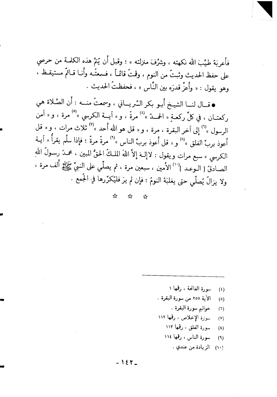 قَالَ لَنَا الشَّيْخُ أَبُو بَكْرِ السَّرْيَانِيُّ، وَسَمِعْتُ مِنْهُ: أَنَّ الصَّلاةَ هِيَ رَكْعَتَانِ، فِي كُلِّ ركعةٍ ((الحمد)) مرةً، و ((أية الْكُرْسِيِّ)) مَرَّةٌ، وَ ((آمَنَ الرَّسُولُ)) إِلَى آخِرِ الْبَقَرَةِ، مَرَّةٌ، وَ ((قل هو الله أحد)) ثَلاثُ مَرَّاتٍ، وَ ((قُلْ أَعُوذُ بِرَبِّ الْفَلَقِ)) وَ ((قُلْ أَعُوذُ بِرَبِّ النَّاسِ)) مَرَّةً مَرَّةً؛ فَإِذَا سَلَّمَ يَقْرَأُ ((آيَةَ الْكُرْسِيِّ)) سَبْعَ مَرَّاتٍ وَيَقُولُ: لا إِلَهَ إِلا اللَّهُ الْمَلِكُ الْحَقُّ الْمُبِينُ، محمدٌ رَسُولُ اللَّهِ الصَّادِقُ [الْوَعْدُ] الأَمِينُ، سَبْعِينَ مَرَّةً، ثُمَّ يُصَلِّي عَلَى ِالنَّبِيِّ صَلَّى اللَّهُ عَلِيهِ وَسَلَّمَ أَلْفَ مَرَّةٍ، وَلا يَزَالُ يُصَلِّي حَتَّى يَغْلِبَّهُ النَّوْمُ؛ فَإِنْ لَمْ يَرَ فَلْيُكِرِّرْهَا فِي الْجُمَعِ.